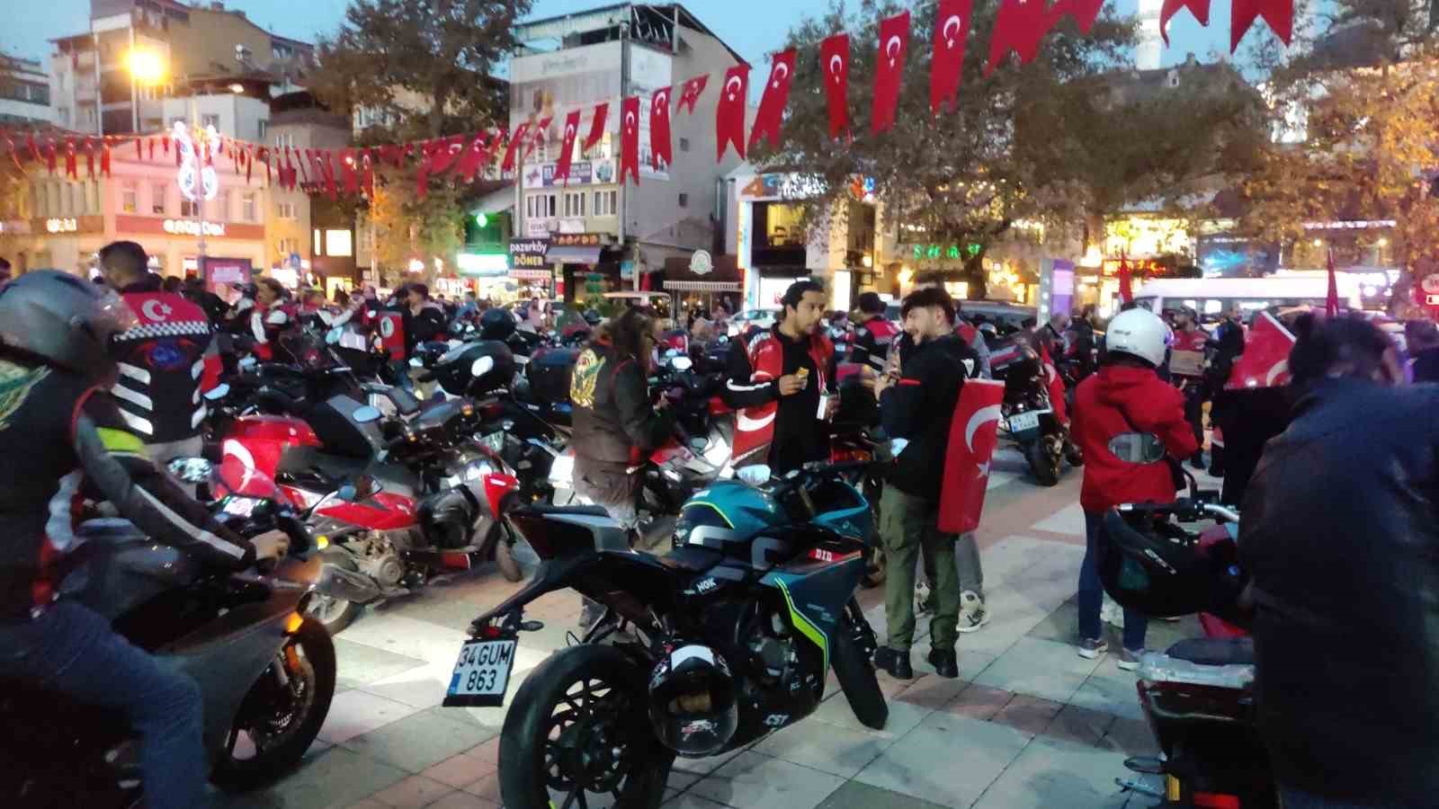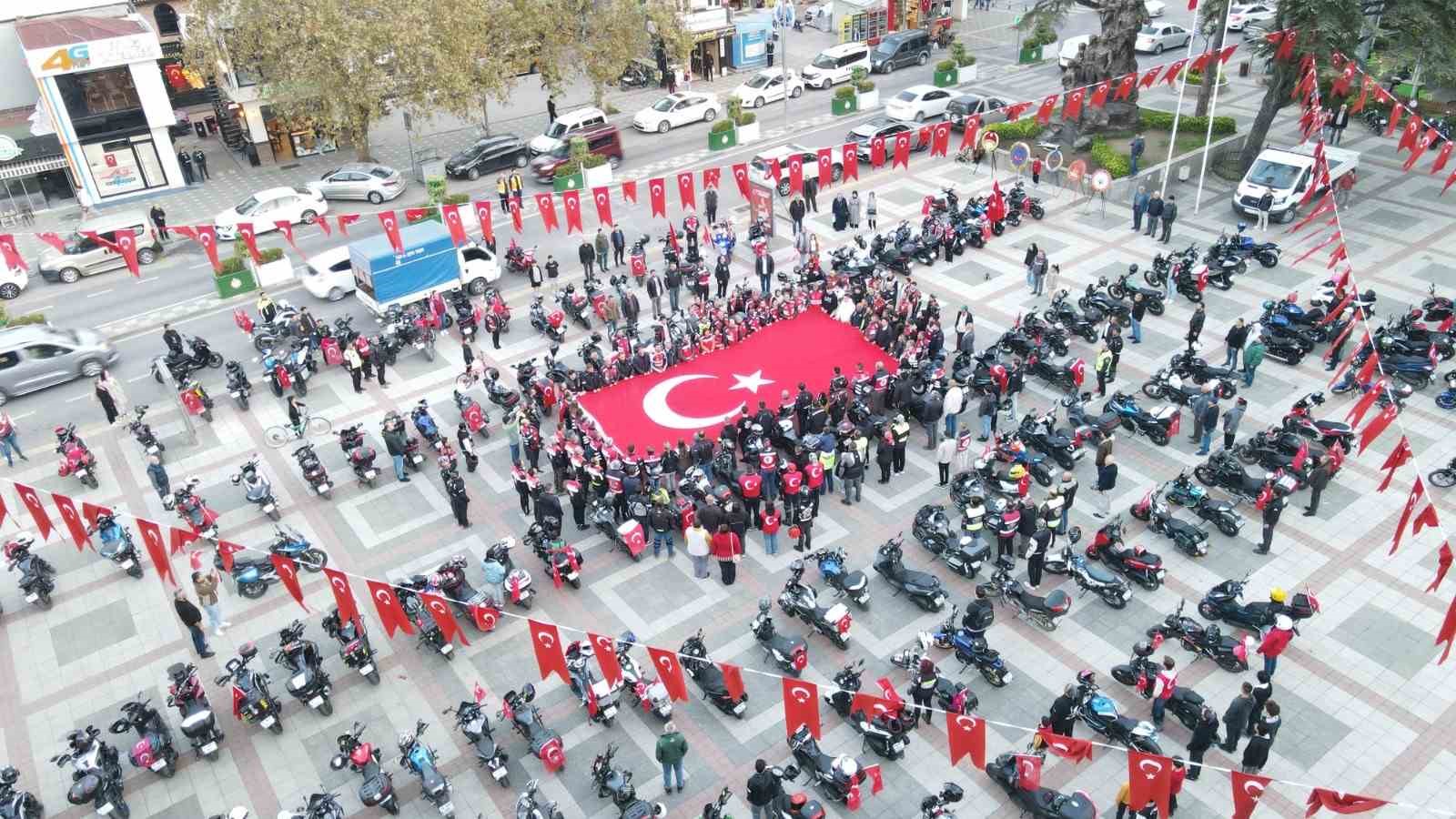 Orhangazi’de akşam saatlerinde toplanan 150 motosikletçi Cumhuriyet Alanında bir araya geldiler. Orhangazi Motosiklet Kulübü, Yeşil Bursa Motosiklet Kulübü, Tüm Emekçi Motosikletli Kuryerle Derneği (TEMKUD), Gezginler Motosiklet Kulübü, İnegöl Motosiklet Kulübü, Moto TİM, Fatih Motosiklet Kulübü üyesi 150 motosiklet ve 200’e yakın motosiklet tutkunu, Cumhuriyet Alanında dev Türk bayrağı açtı. Saygı duruşunda bulunan ve İstiklal Marşı okuyan 150 motosiklet Türk bayrakları ve marşlar eşliğinde Orhangazi ilçe merkezinde şehir turu atarak Cumhuriyet’in 101. yıldönümü kutladı.