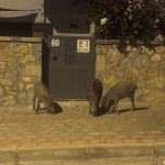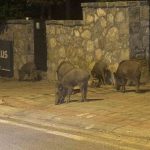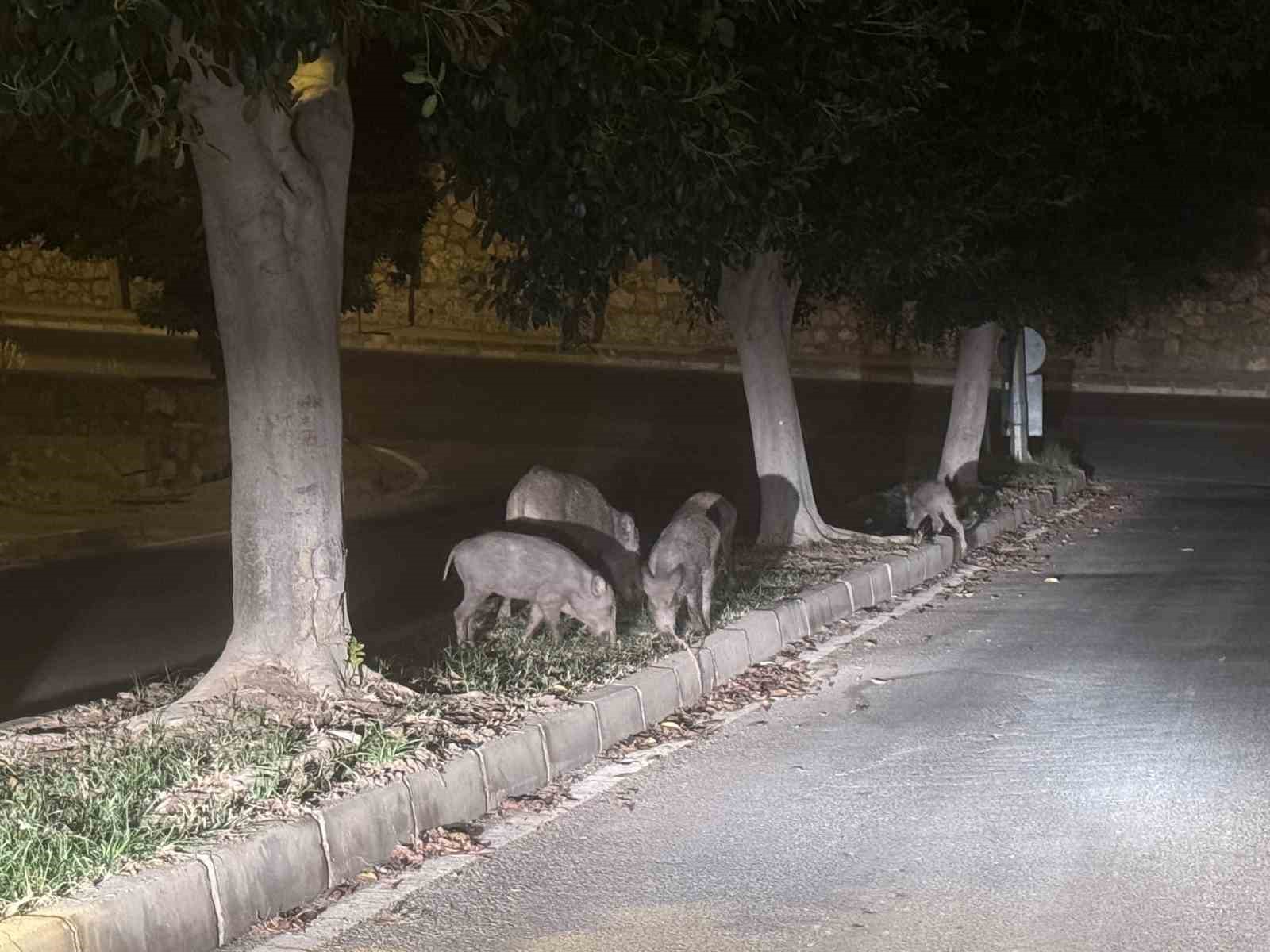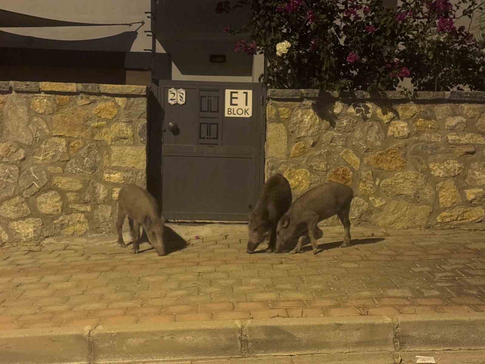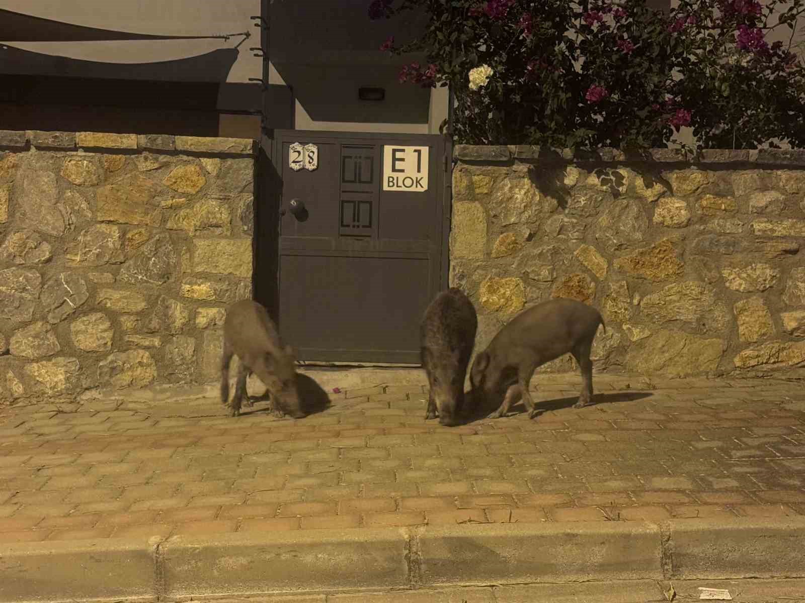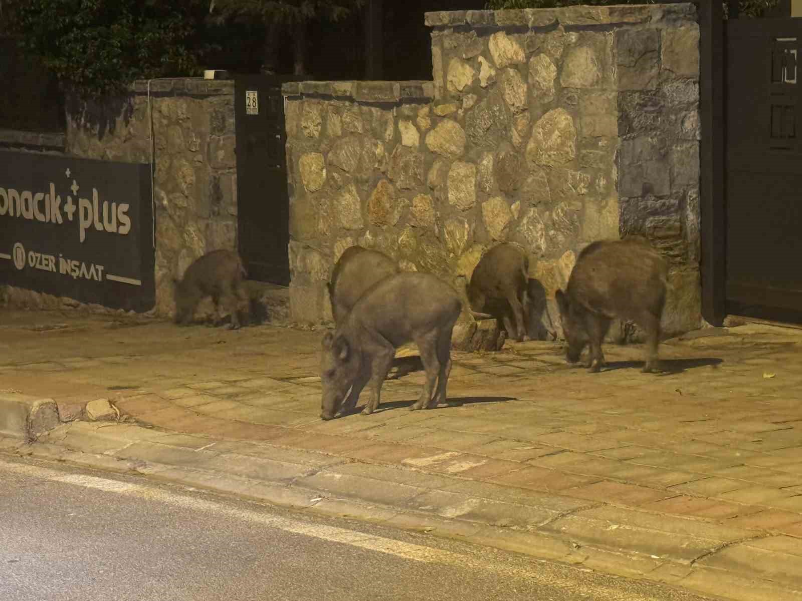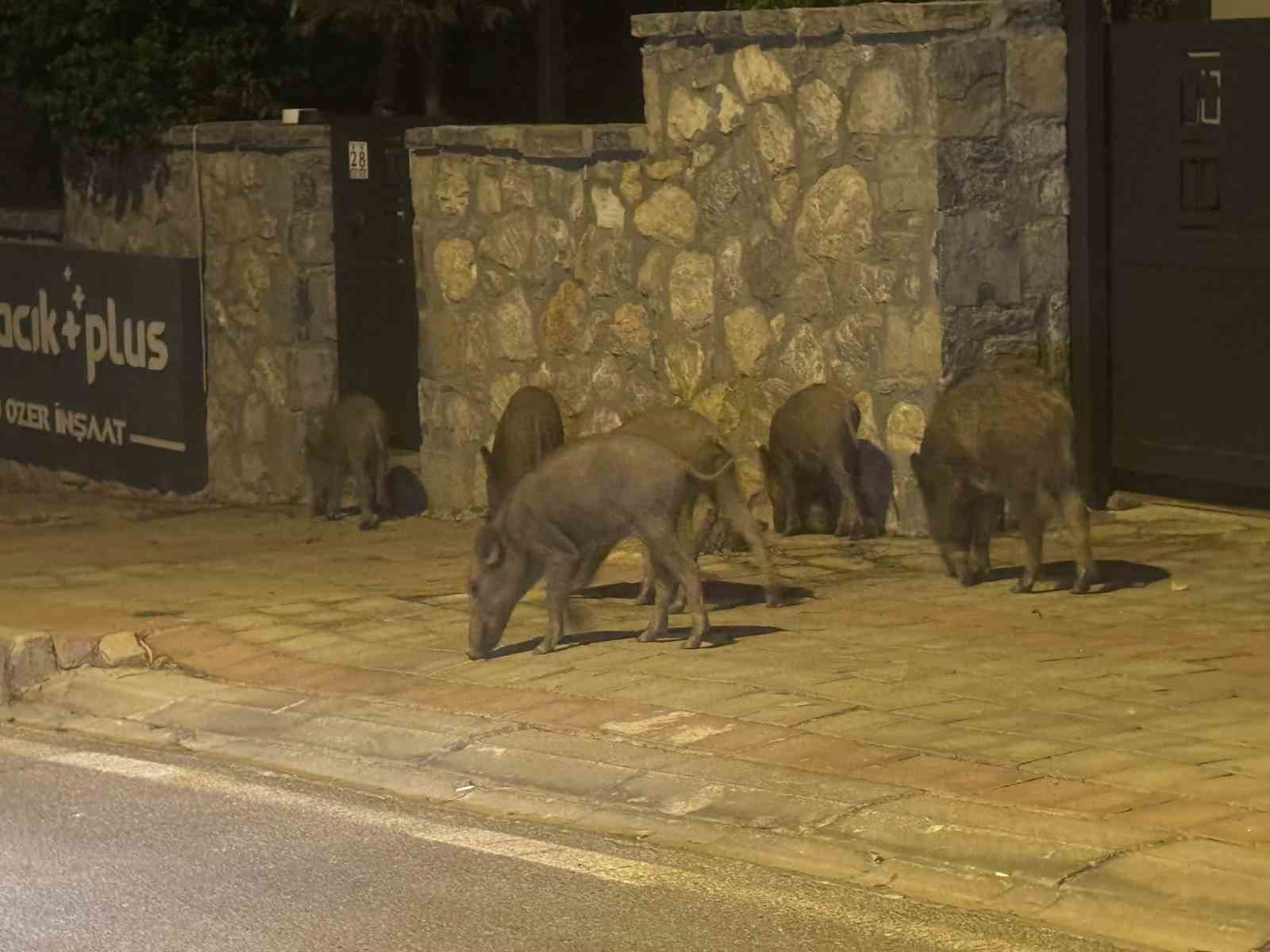 Bodrum’un Konacık Mahallesi’nde bir grup domuz şehre inerek yiyecek aradı. Yavrularla birlikte yaklaşık 20 domuz sokaklarda, çöp konteynerlerinde yiyecek aradı. Sitelerin içerisinden geçen domuzların insanlara ve araçlara aldırış etmemesi de dikkatlerden kaçmadı. Bazı vatandaşlar araçlarıyla durup domuzların fotoğraflarını çekerken, bazıları ise hızlıca bölgeden uzaklaştı. Domuzlar daha sonra gözden kayboldu.