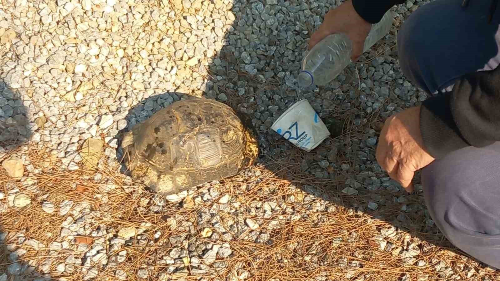 Muğla’nın Dalaman ilçesinde çıkan orman yangını doğal hayatı olumsuz etkilerken, alevlerden kaçan bir kaplumbağaya çevredekiler tarafından su verilerek, güvenli alana bırakıldı.