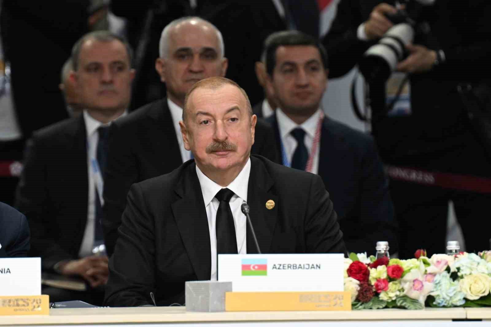 Azerbaycan Cumhurbaşkanı İlham Aliyev, BRICS oturumunda yaptığı konuşmada, “Biz artık güney ve kuzey arasında iklim konusunda işbirliği yapıyoruz. İster iklim değişikliğiyle ilgili meselelerde, ister küresel güvenlik, uluslararası hukukun üstünlüğü, iç işlerine karışmama ve karşılıklı saygı gibi konularda olsun ortak anlayışa ulaşmak için çabalarımızı sürdüreceğiz” dedi.