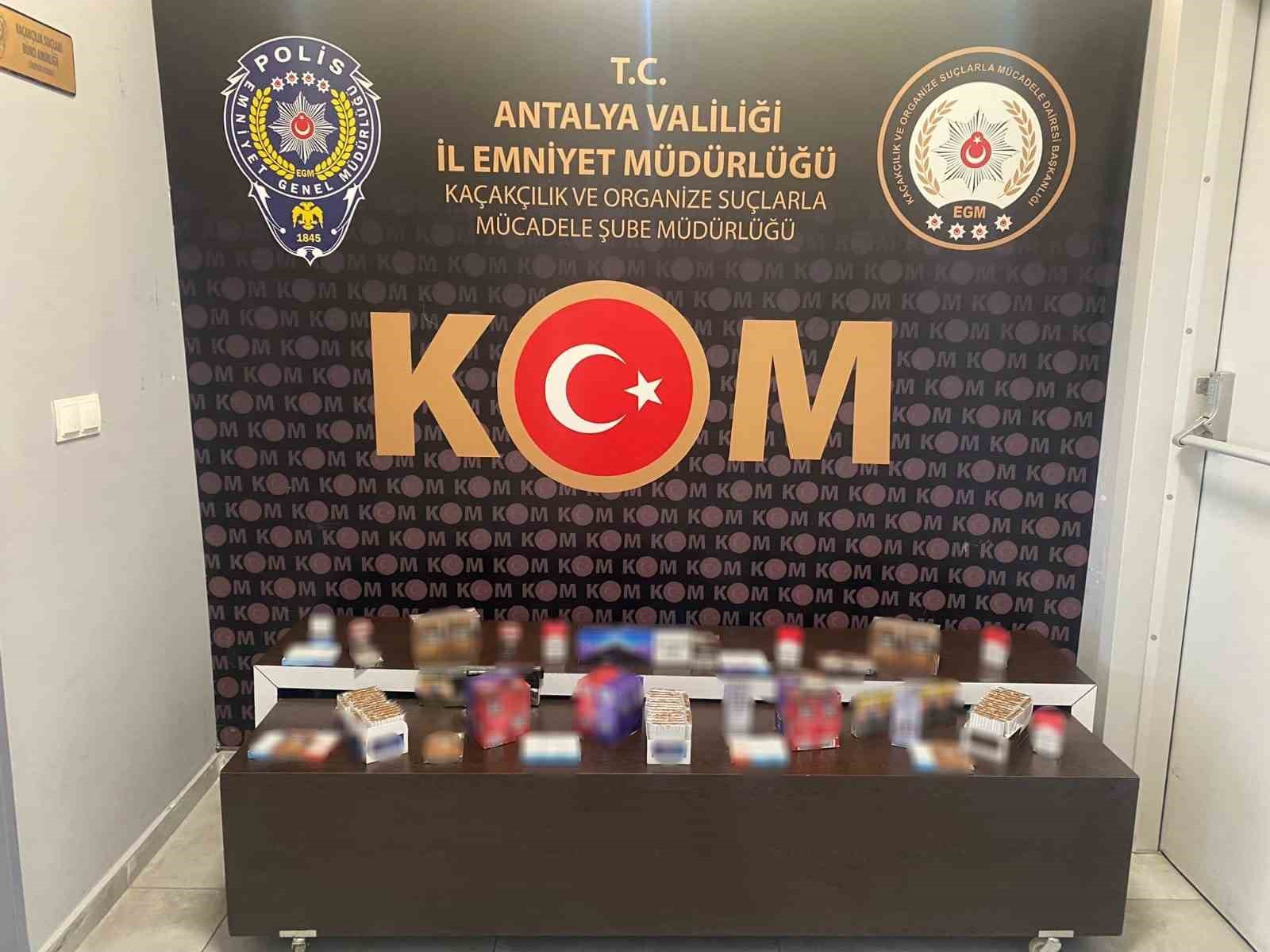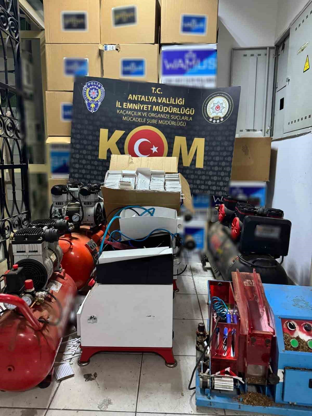 Antalya Cumhuriyet Başsavcılığı koordinesinde, Kaçakçılık ve Organize Suçlarla Mücadele (KOM) Şube Müdürlüğü ekiplerince Muratpaşa, Kepez ve Alanya ilçelerinde operasyonlar gerçekleştirildi. Operasyonlarda 667 bin 420 adet dolu/boş makaron, 19 bin 500 sigara sarma kağıdı, 2 bin 900 paket gümrük kaçağı sigara, 910 adet puro, 670 elektronik sigara ve 665 adet cinsel içerikli hap/jel, 135 kilogram kıyılmış tütün, 110 kilogram nargile tütünü, 3 adet sigara basım makinesi ve 3 kompresör ele geçirildi.