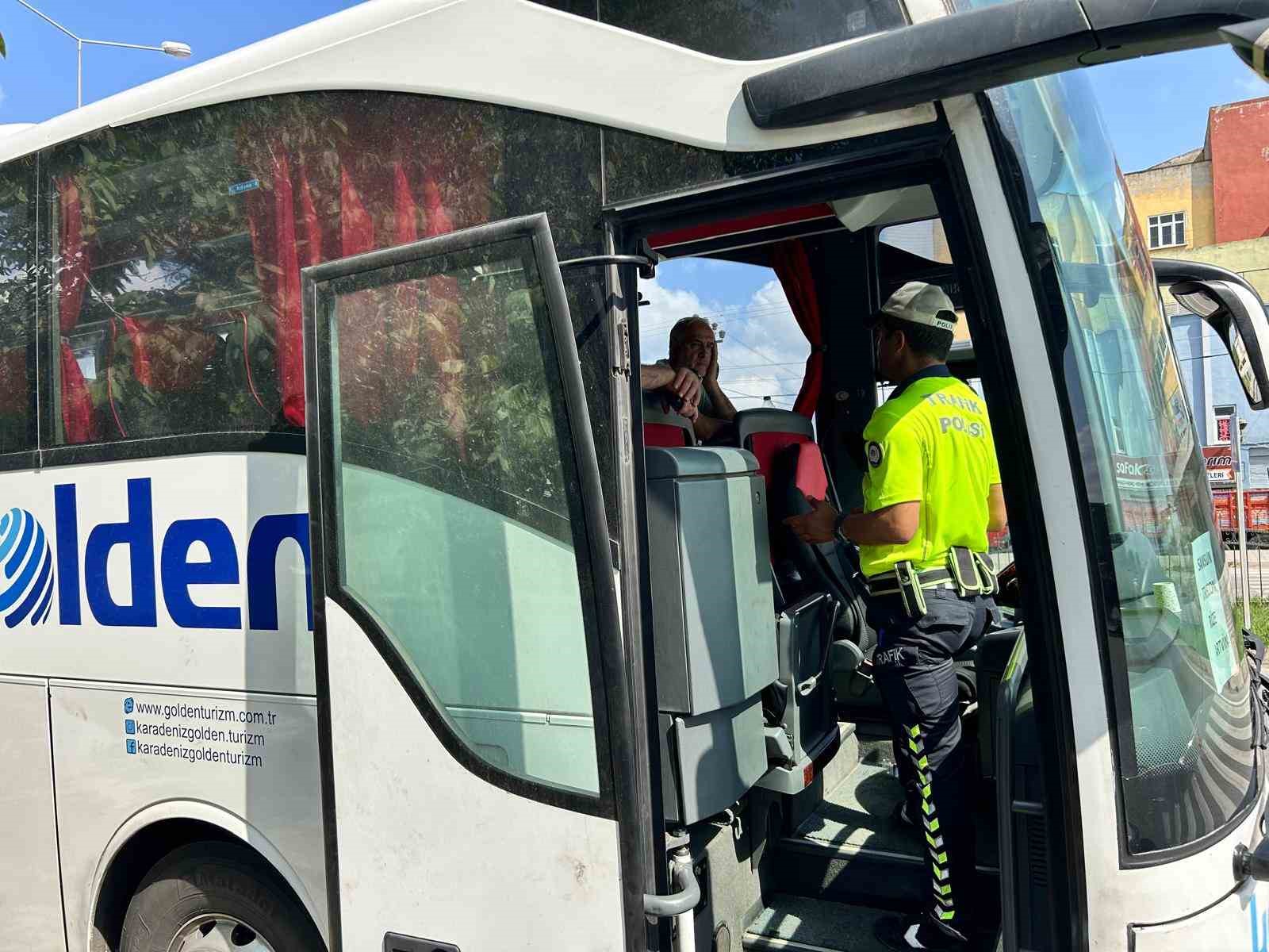 Samsun-Sinop karayolunda durdurulan yolcu taşımacılığı yapan araçlarda, sürücü ve yolculara emniyet kemeri kullanımının önemini vurgulandı.