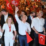 Konuşmanın ardından Başkan Bozbey, eşi Seden Bozbey ile alanı dolduran binlerce Bursalıyı Türk Bayrağı ile selamladı. Ardından usta sanatçı Nilüfer sahne alarak sevilen şarkılarını seslendirdi.