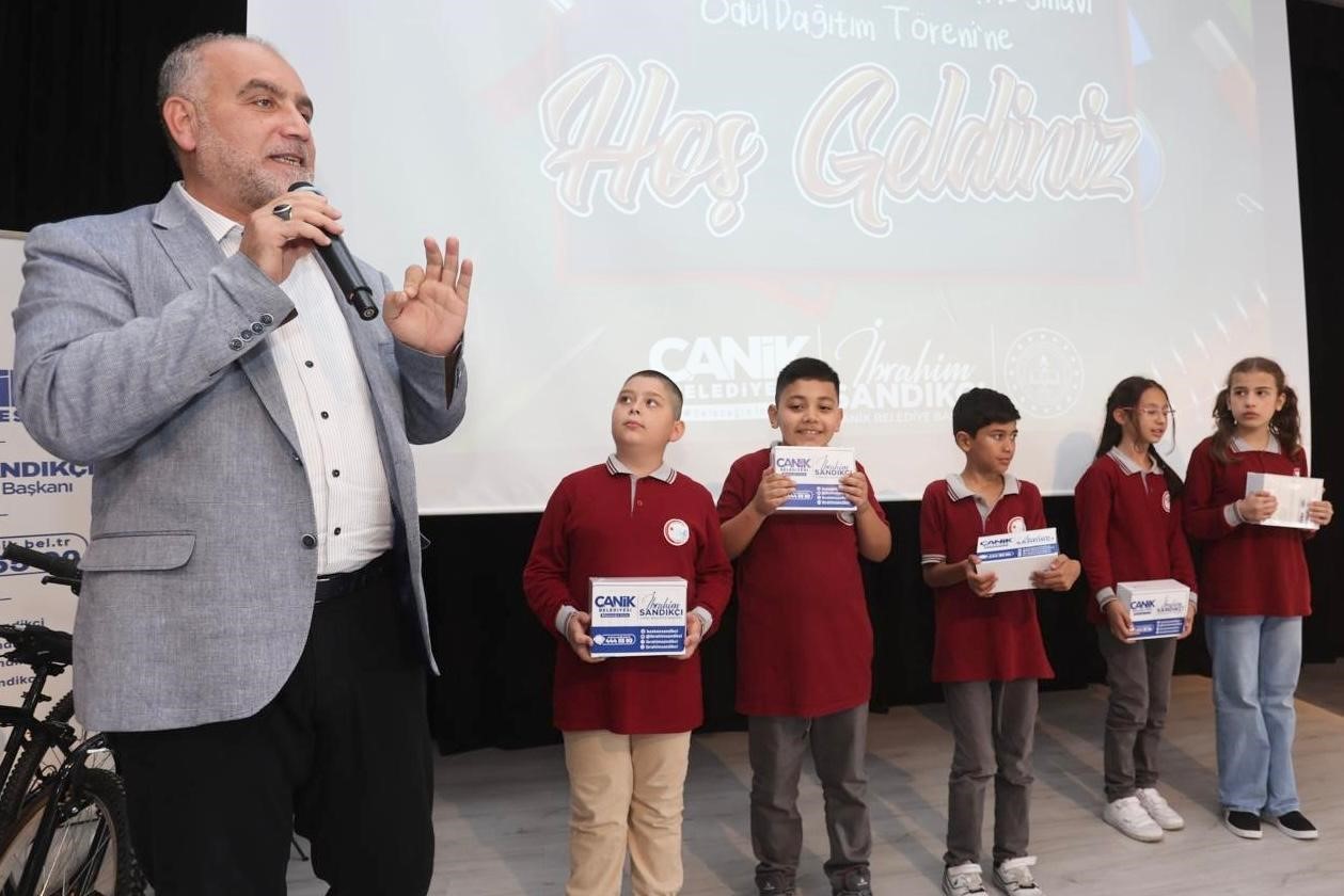 Canik Belediye Başkanı İbrahim Sandıkçı, eğitime yönelik projelerle öğrencilere destek olmayı sürdürdüklerini belirtti. Canik İmam Hatip Ortaokulu’nda düzenlenen Yabancı Dil Ağırlıklı Sınıf Seçme Sınavı Ödül Töreni’nde öğrencilerle bir araya gelen Başkan İbrahim Sandıkçı, sınavda dereceler elde eden öğrencilere bisiklet, bluetooth kulaklık, akıllı saat ve video oyun konsolu ödüllerini takdim ederek onları başarılarından dolayı kutladı. Eğitim alanına yönelik çalışmaları büyük bir hassasiyetle sürdürdüklerini ifade eden Başkan İbrahim Sandıkçı, “Eğitime yönelik projelerimizle kıymetli öğrencilerimizin her zaman yanındayız” diye konuştu.