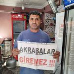İş yerinin ortağı olan Hasan Eriş ise, “Akrabalardan sıkıldığımız için bu pankartı astık; yeter artık. Gelen yiyor, içiyor, parasını vermiyor. Akraba değil akreptirler” sözlerine yer verdi.