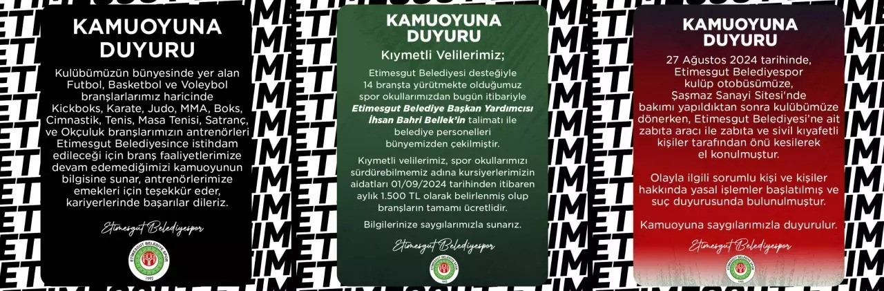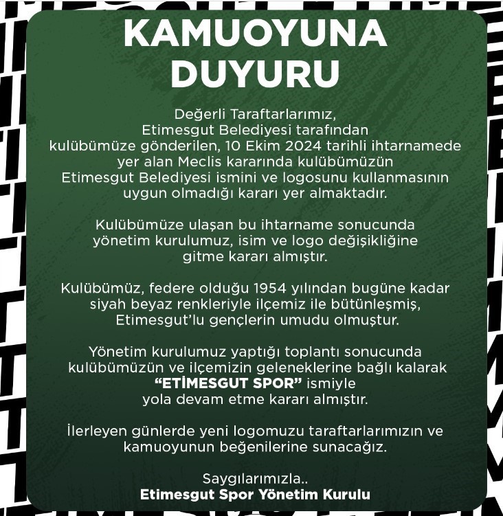 “Değerli taraftarlarımız, Etimesgut Belediyesi tarafından kulübümüze gönderilen, 10 Ekim 2024 tarihli ihtarnamede yer alan Meclis kararında kulübümüzün Etimesgut Belediyesi ismini ve logosunu kullanmasının uygun olmadığı kararı yer almaktadır. Kulübümüze ulaşan bu ihtarname sonucunda yönetim kurulumuz, isim ve logo değişikliğine gitme kararı almıştır. Kulübümüz, federe olduğu 1954 yılından bugüne kadar siyah beyaz renkleriyle ilçemiz ile bütünleşmiş, Etimesgutlu gençlerin umudu olmuştur. Yönetim kurulumuz yaptığı toplantı sonucunda kulübümüzün ve ilçemizin geleneklerine bağlı kalarak ’Etimesgutspor’ ismiyle yola devam etme kararı almıştır. İlerleyen günlerde yeni logomuzu taraftarlarımızın ve kamuoyunun beğenilerine sunacağız.”