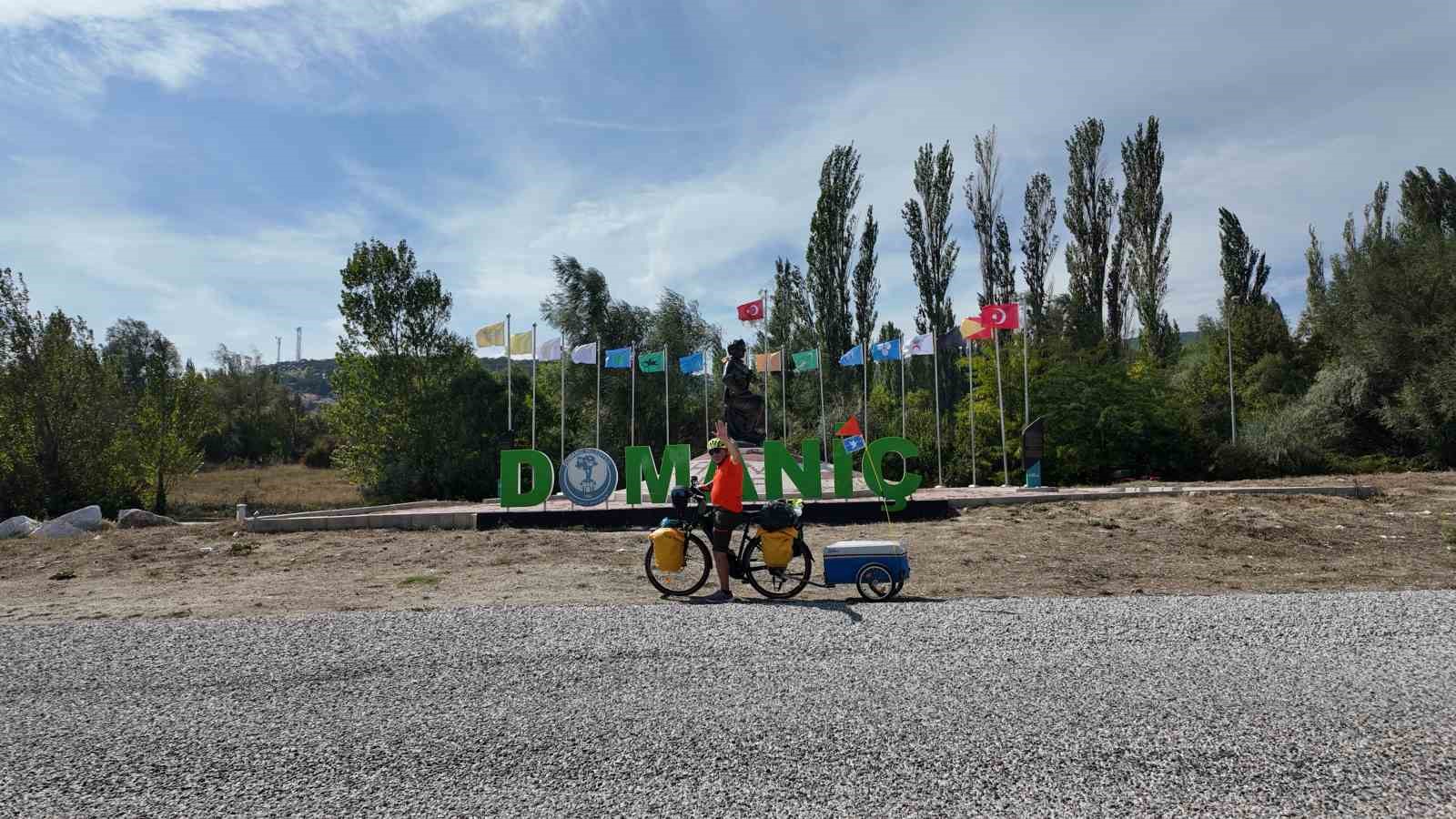Bisikletiyle başladığı geziyle barışı dünyaya yaymayı hedeflediğini belirten gezgin Metin Sert, Kütahya’nın Domaniç ilçesine geldi.