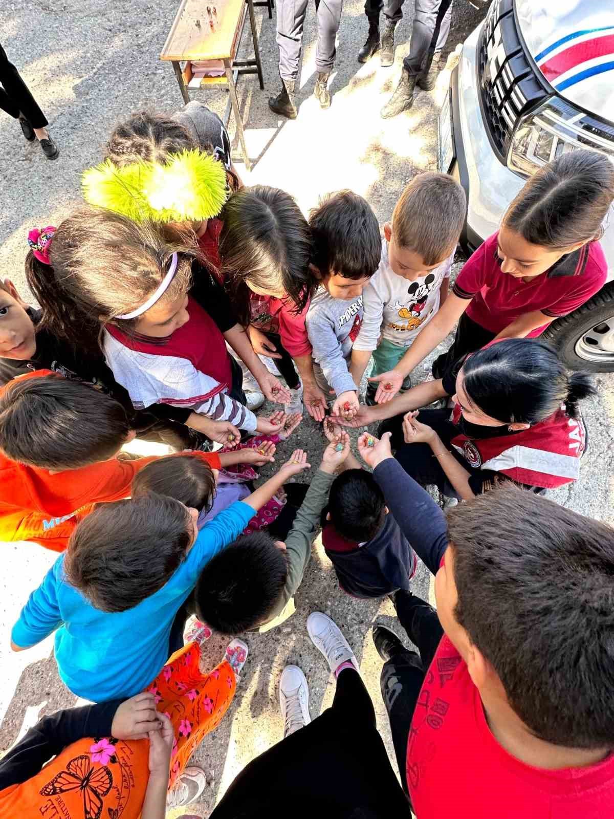 Öğrencilere, çevre bilinci ve ağaç sevgisinin önemini anlatmak amacıyla atık kağıtlardan ve çam ağacı tohumlarından hazırlanan tohum topları; ormanlık alanlar, boş araziler ve okul bahçesine bırakıldı. Etkinlikte, çocuklara ’her şey elimizde’ mottosuyla çevrenin korunması ve ağaçlandırmanın gerekliliği vurgulandı. Jandarma timi, çocukların erken yaşta çevre bilinci geliştirmelerini sağlamak için kısa bir eğitim verilirken, öğrencilere tohumların nasıl hazırlandığı ağaçların ekim süreci ve doğanın korunması konularında bilgilendirmelerde bunuldu.
