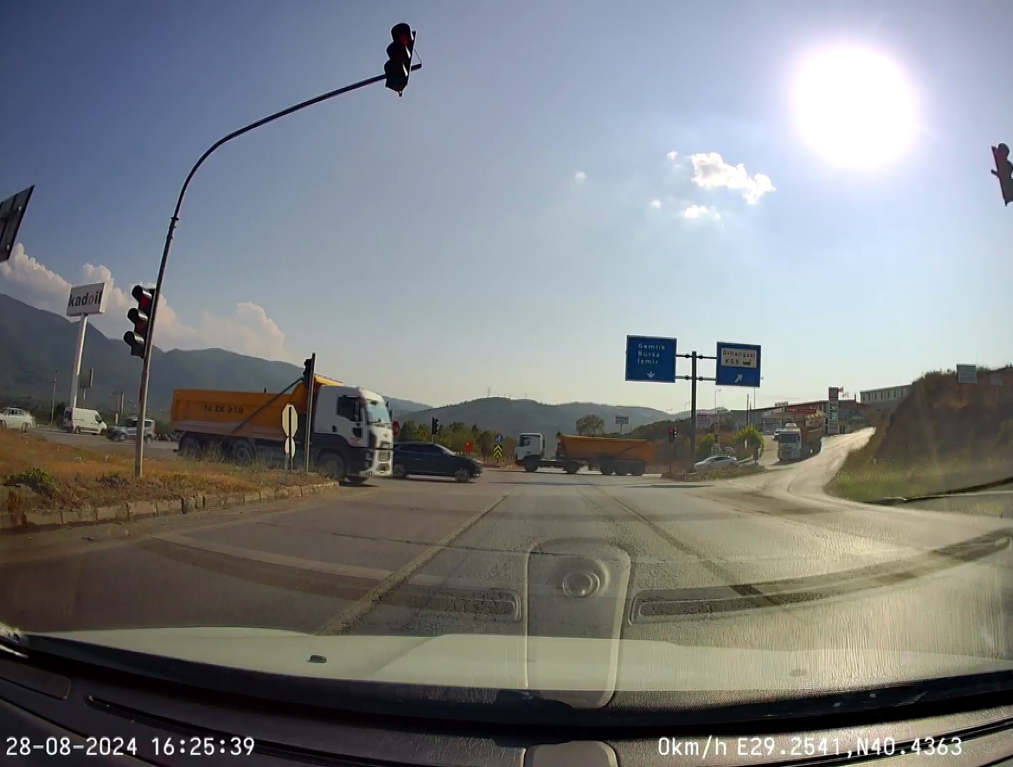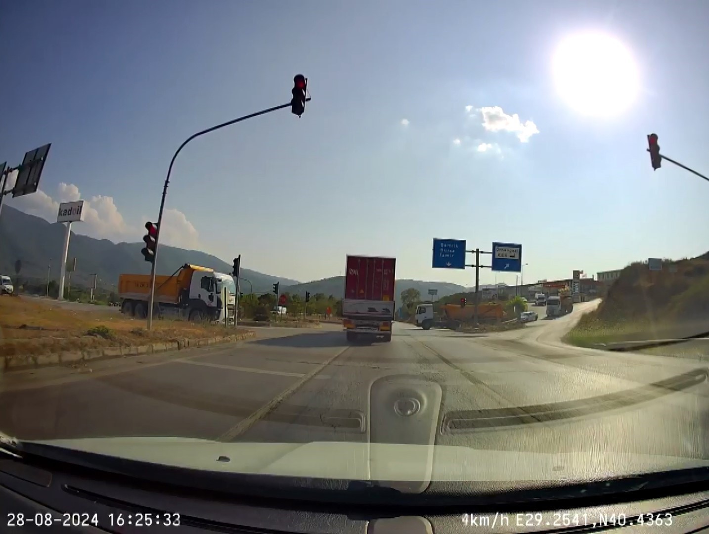 Olay, Orhangazi ilçesi Bursa-Yalova yolu üzerinde meydana geldi. Kırmızı ışık yanmasına rağmen durmayarak süratli bir şekilde kavşaktan geçen tır, dehşet saçtı. Trafikteki diğer sürücüler duruma tepki gösterdi. O anlar bir aracın güvenlik kamerasına saniye saniye yansıdı.