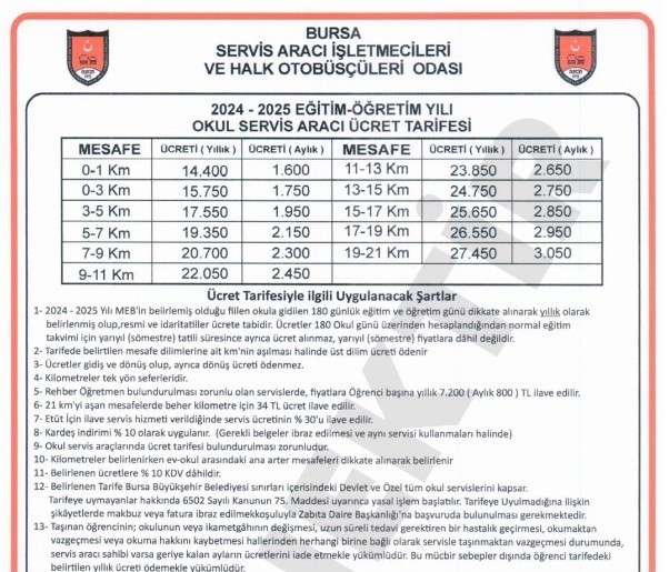 BURSA’DA 2024-2025 EĞİTİM ÖĞRETİM YILI İÇİN OKUL SERVİSİ FİYATLARI BELLİ OLDU. YÜZDE 46 ZAM YAPILAN TARİFELERDE EN YAKIN HAT BİN 600 LİRA, EN UZUN HAT İSE 3 BİN 50 LİRA OLARAK AÇIKLANIRKEN, REHBER BULUNDURMA ZORUNLULUĞU OLAN ARAÇLARDA İSE ÖĞRENCİLERİN AYRICA 800 LİRA EK ÜCRET ÖDEYECEĞİ İFADE EDİLDİ.