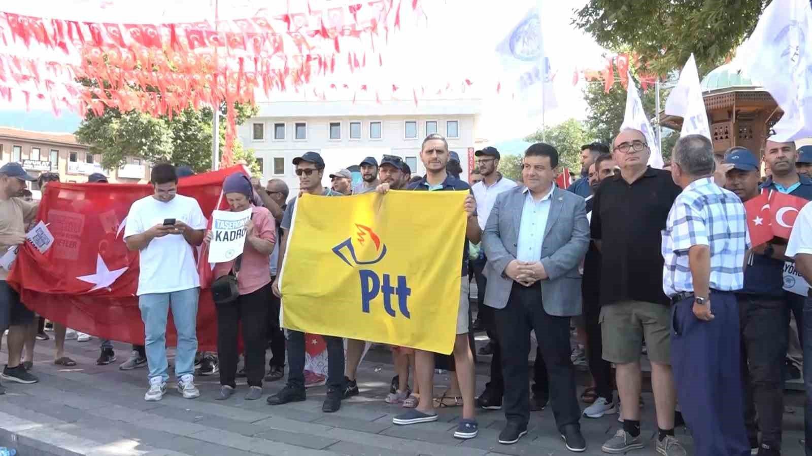 Bursa’da PTT çalışanları zor şartlar altında çalıştıklarını ve maaşlarına iyileştirme almadıkları gerekçesiyle toplanarak açıklamada bulundu.