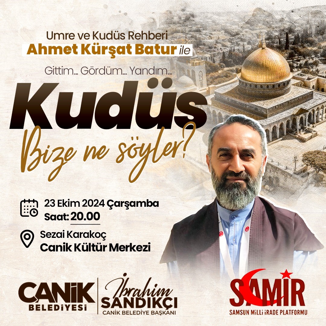 Canik Belediyesi ve Samsun Milli İrade Platformu (SAMİR) iş birliğiyle ilçede düzenlenecek olan ‘Kudüs Bize Ne Söyler?’ adlı konferans programında, vatandaşlarla bir araya gelecek olan Umre ve Kudüs Rehberi Ahmet Kürşat Batur, İsrail’in Filistin’de sürdürdüğü soykırım ve Kudüs’ün İslam dünyası için olan önemi hakkında vatandaşlara bilgilendirmelerde bulunacak. ‘Kudüs Bize Ne Söyler?’ adlı konferans programı, 23 Ekim Çarşamba günü saat 20.00’de Sezai Karakoç Canik Kültür Merkezi’nde gerçekleşecek.