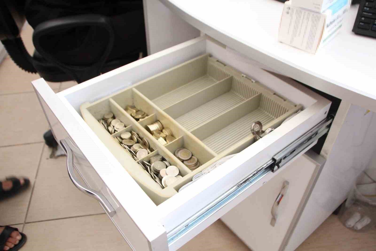 Hırsızlık anı güvenlik kamerası tarafından saniye saniye kaydedilirken, görüntülerde hırsızın ilaçları ve çekmecedeki paraları bir çantaya doldurduğu anlar yer aldı.