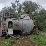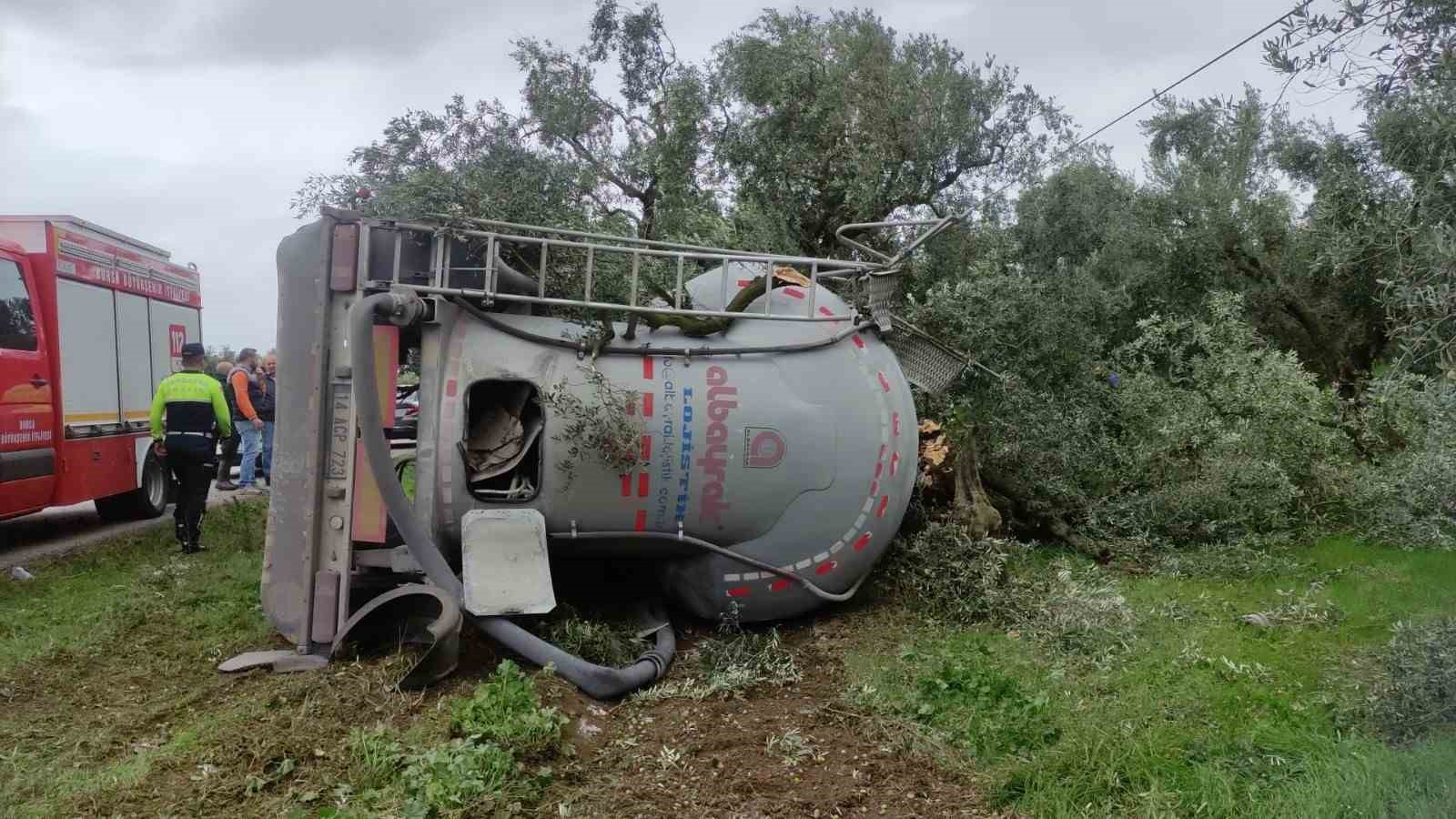 Bursa’nın Orhangazi ilçesi İznik yolu üzerinde çimento malzemesi yüklü bir tanker kontrolden çıkarak zeytinliğe devrildi. Zeytin ağaçlarını parçalayarak duran tırın sürücüsü yaralandı.
