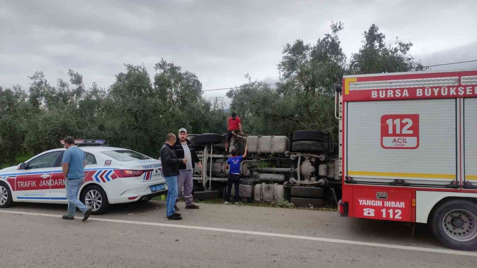 Kaza, saat 12.00 sıralarında Orhangazi-İznik Karayolu Üreğil altı mevkiinde meydana geldi. Edinilen bilgilere göre, Erdi Yeşilyurt (27) idaresindeki 14 GM 510 plakalı çimento malzemesi yüklü tanker İznik istikametinden Orhangazi istikametine doğru seyir halindeyken henüz belirlenemeyen bir nedenle kontrolden çıktı. Yoldan çıkan tanker zeytinliğe dalarak devrildi. Zeytin ağaçlarını kırarak duran tanker sürücüsü yaralandı. İhbar üzerine olay yerine sağlık ve itfaiye ekipleri sevk edildi. Kabin içerisinden itfaiye ekipleri tarafından çıkarılan sürücü ambulansla Orhangazi Devlet Hastanesine kaldırıldı. Sürücünün hayati tehlikesi bulunmazken, jandarma ekipleri kaza ile ilgili soruşturma başlattı.