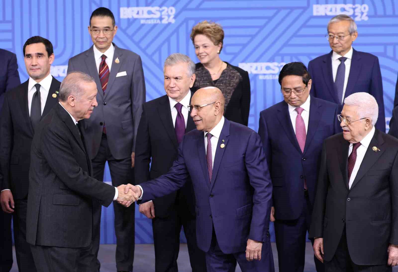 Cumhurbaşkanı Recep Tayyip Erdoğan, Rusya’ya bağlı Tataristan’ın başkenti Kazan’da düzenlenen BRICS Liderler Zirvesi kapsamında aile fotoğrafı çekimine katıldı. Fotoğraf çekiminde Cumhurbaşkanı Erdoğan’ın sağında Güney Afrika Devlet Başkanı Cyril Ramaphosa, solunda Moritanya Devlet Başkanı Muhammed Veled Gazvani yer aldı. Erdoğan, fotoğraf çekiminin ardından Güney Afrika Devlet Başkanı Ramaphosa ile selamlaştı. Liderler daha sonra zirvenin düzenlendiği salona geçti.