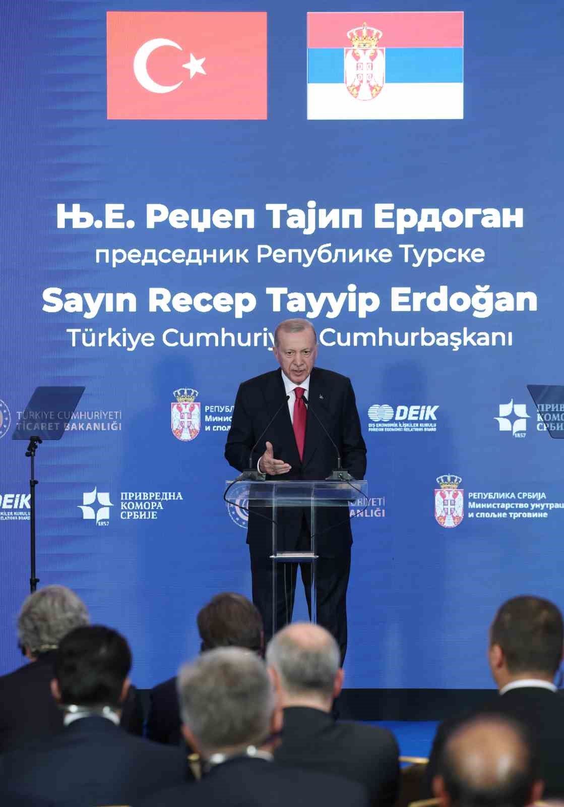 Cumhurbaşkanı Recep Tayyip Erdoğan, Sırbistan’daki temaslarını sürdürüyor. Erdoğan, başkent Belgrad’da DEİK/Türkiye-Sırbistan İş Konseyi ve Sırbistan Ticaret Odası (PKS) tarafından düzenlenen Türkiye-Sırbistan İş Forumu’nda hitap etti. Erdoğan yaptığı konuşmada, bakanların ve iş dünyasının farklı sektörlerinden temsilcilerinin yer aldığı geniş bir heyetle gerçekleştirilen Sırbistan ziyaretinin bu ülkeye verilen önemin açık bir göstergesi olduğunu söyledi. Erdoğan, “Türkiye-Sırbistan İş Forumu’nun ülkelerimiz ve siz iş adamlarımız için hayırlara vesile olmasını temenni ediyorum. Ülkelerimiz arasındaki iş birliğini, tarihi ve kültürel bağlarımızdan ilham alarak daha da geliştirme gayretindeyiz. Bölgede istikrar ve refahın hüküm sürmesi için Sırbistan ile birlikte çalışıyor, bunu yaparken de güçlü ekonomiler inşa ediyoruz” dedi.