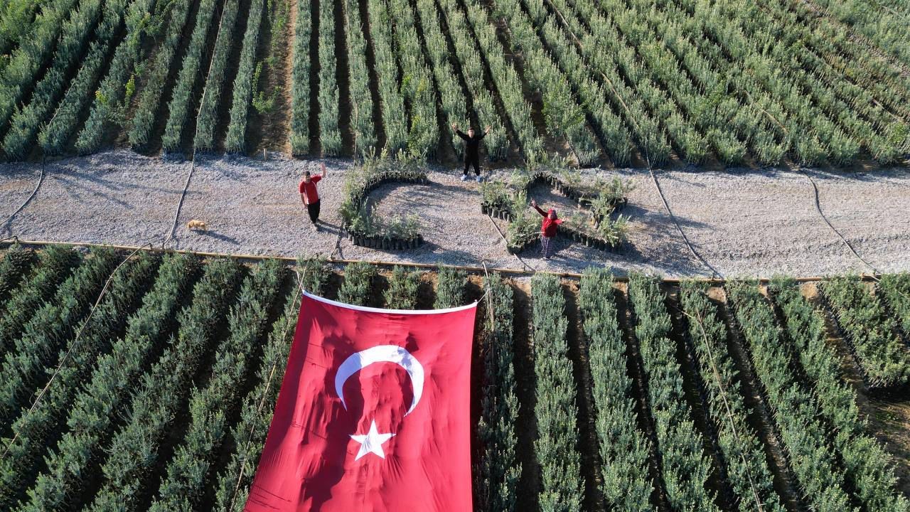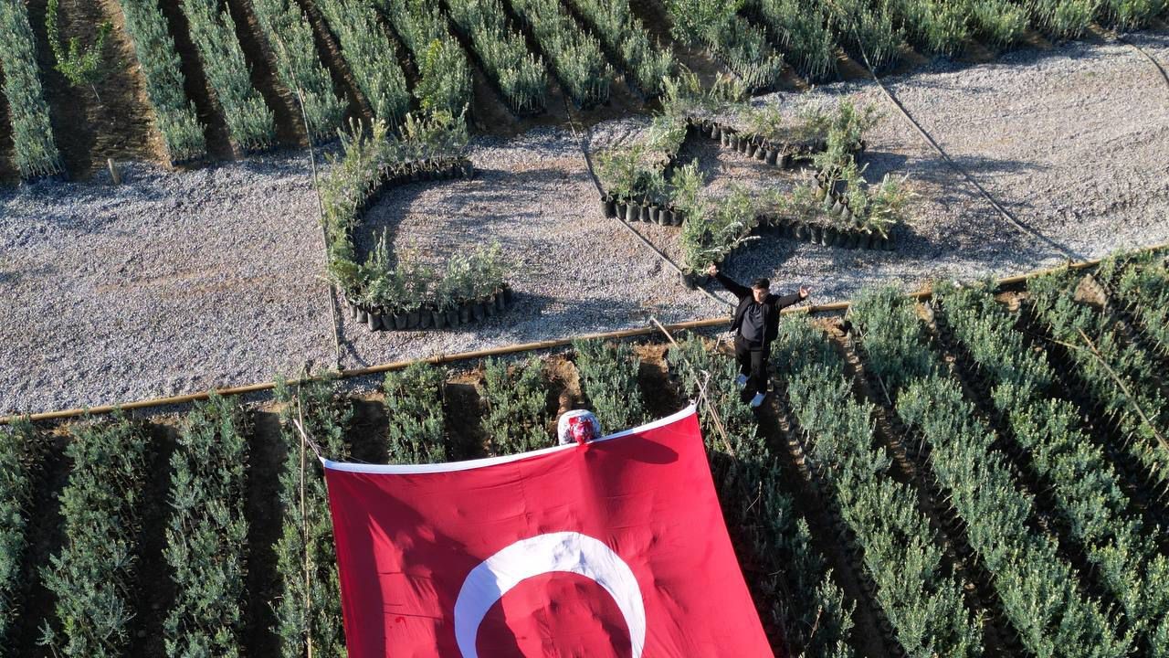 Bursa’nın İznik ilçesinde bir fidan işletmecisi Cumhuriyetin 101. yılını kutlamak için özel bir etkinliğe imza attı. İşletmeci Sinan Demircan, zeytin bahçesine dev Türk Bayrağı açtı, zeytin fidanlarıyla Türk Bayrağı’nın simgesi ay ve yıldızı oluşturdu.