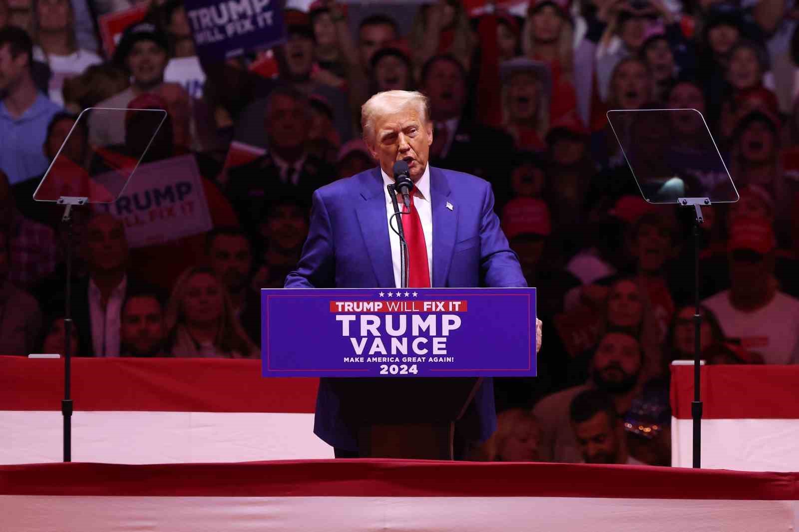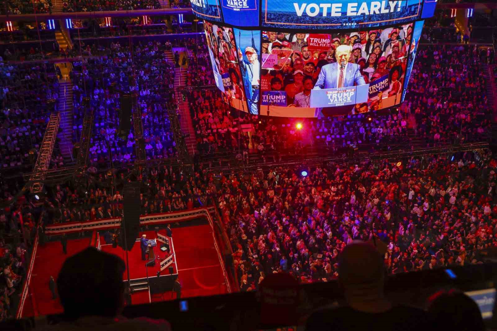 ABD’de Demokrat Parti’nin kalesi olarak bilinen New York, 5 Kasım başkanlık seçimlerine 8 gün kala Cumhuriyetçi Parti Başkan Adayı Donald Trump ve Başkan Yardımcısı Adayı JD Vance’in Madison Square Garden’daki büyük mitingine sahne oldu. Yaklaşık 19 bin 500 kişi kapasiteli Madison Square Garden’ı tamamen dolduran Trump destekçileri, New York gibi bir kentte yoğun bir destek gösterisiyle dikkat çekti. Yetkililer, yaklaşık 200 bin kişinin mitinge katılmak için alana geldiğini, salona giremeyen binlerce destekçinin çevrede kurulan dev ekranlardan etkinliği izlediğini bildirdi.