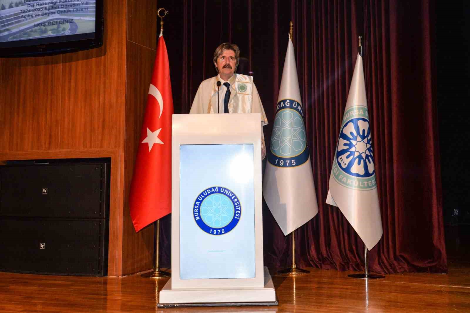 Diş Hekimliği Fakültesi Dekanı Prof. Dr. Alper Pampu ise entegre bir eğitim sistemi uyguladıklarının altını çizdi. 5 yıllık eğitim süreci içerisinde teorik ve pratik eğitimlerin uygulandığını söyleyen Prof. Dr. Alper Pampu öğrencilere seslenerek; “Bursa Uludağ Üniversitesi ve Diş Hekimliği Fakültesi ailemize hoş geldiniz. Bugün burada beyaz önlüklerinizi giyecek ve mesleğe ilk adımlarınızı atmış olacaksınız. 5 yıllık eğitimin sonunda donanımlı hekimler olarak sizleri uğurlayacağız. Ailelerimize de teşekkür ediyoruz. Evlatlarını bize teslim ettiler. Nitelikli birer diş hekimi olarak geri alacaklar. Yeni dönemin hepimize hayırlı, uğurlu olmasını diliyorum” dedi.
