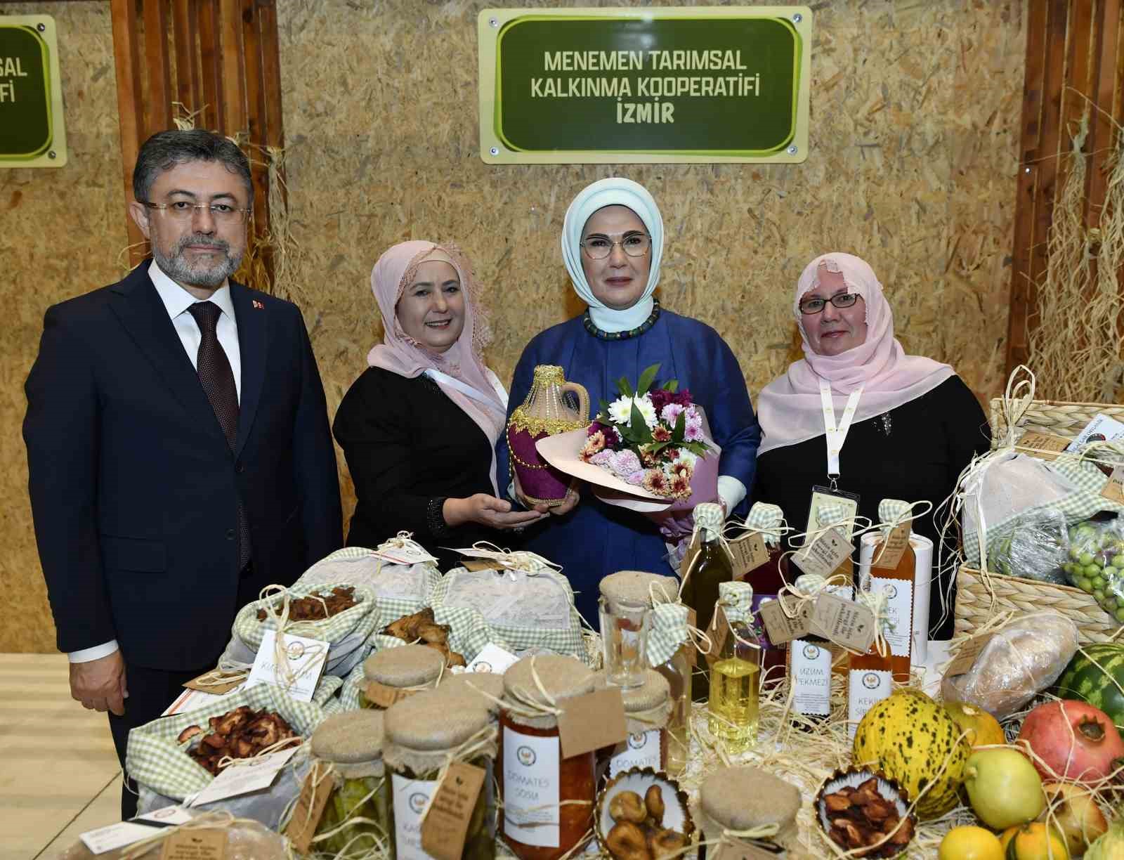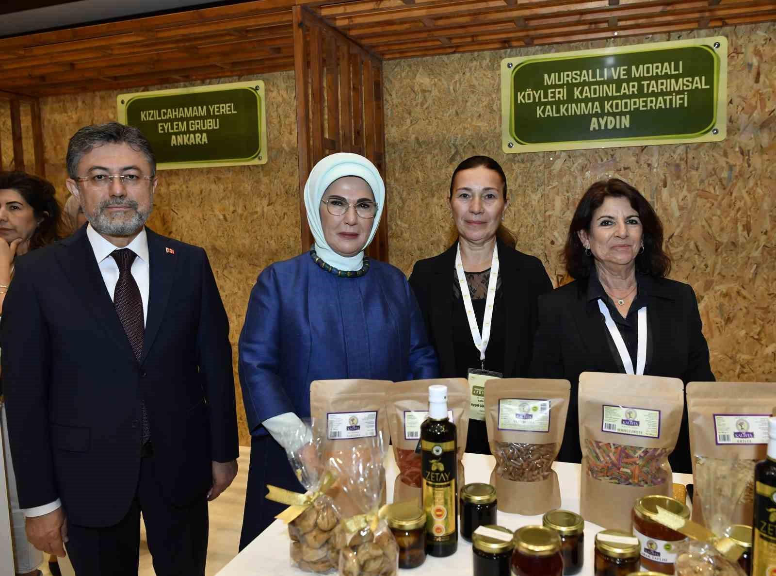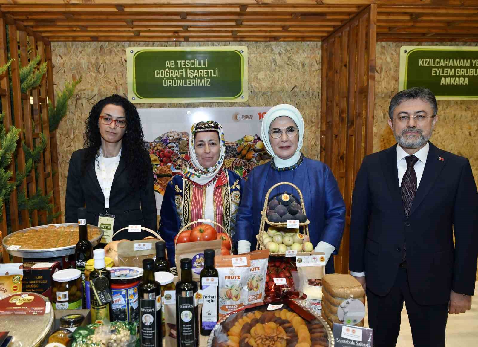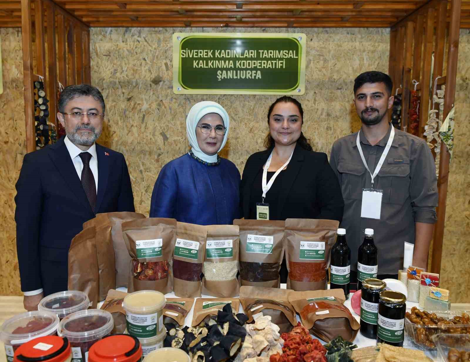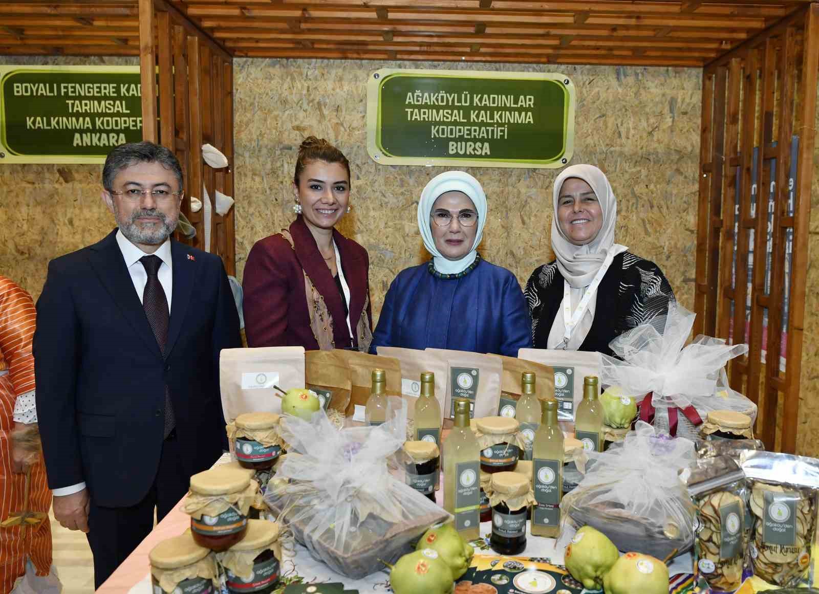 Emine Erdoğan, Bakan Yumaklı ile 15 Ekim Dünya Kadın Çiftçiler Günü dolayısıyla Türkiye’nin çeşitli bölgelerinden 18 kadın kooperatifince fuaye alanında açılan stantları gezdi.