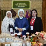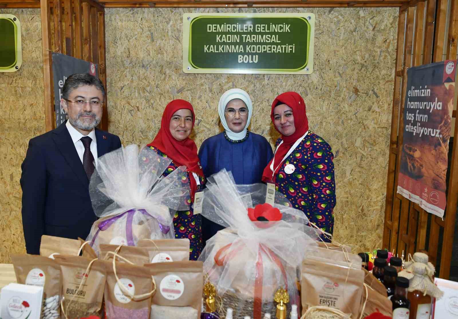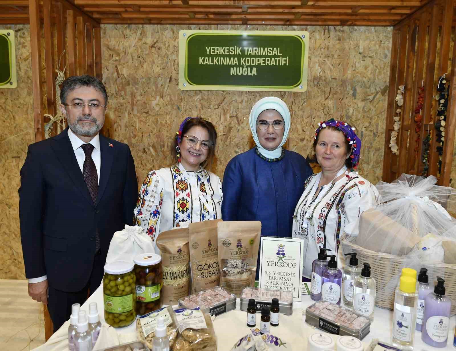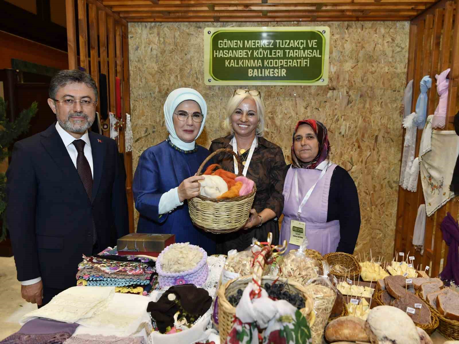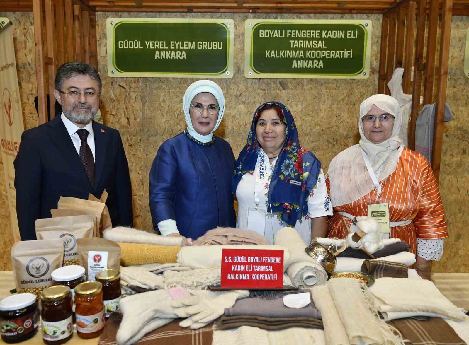 Emine Erdoğan, Bakan Yumaklı ile 15 Ekim Dünya Kadın Çiftçiler Günü dolayısıyla Türkiye’nin çeşitli bölgelerinden 18 kadın kooperatifince fuaye alanında açılan stantları gezdi.