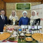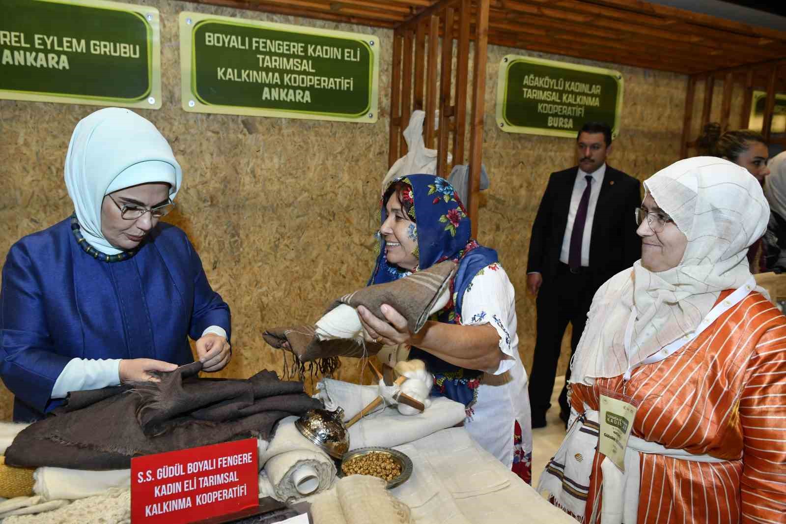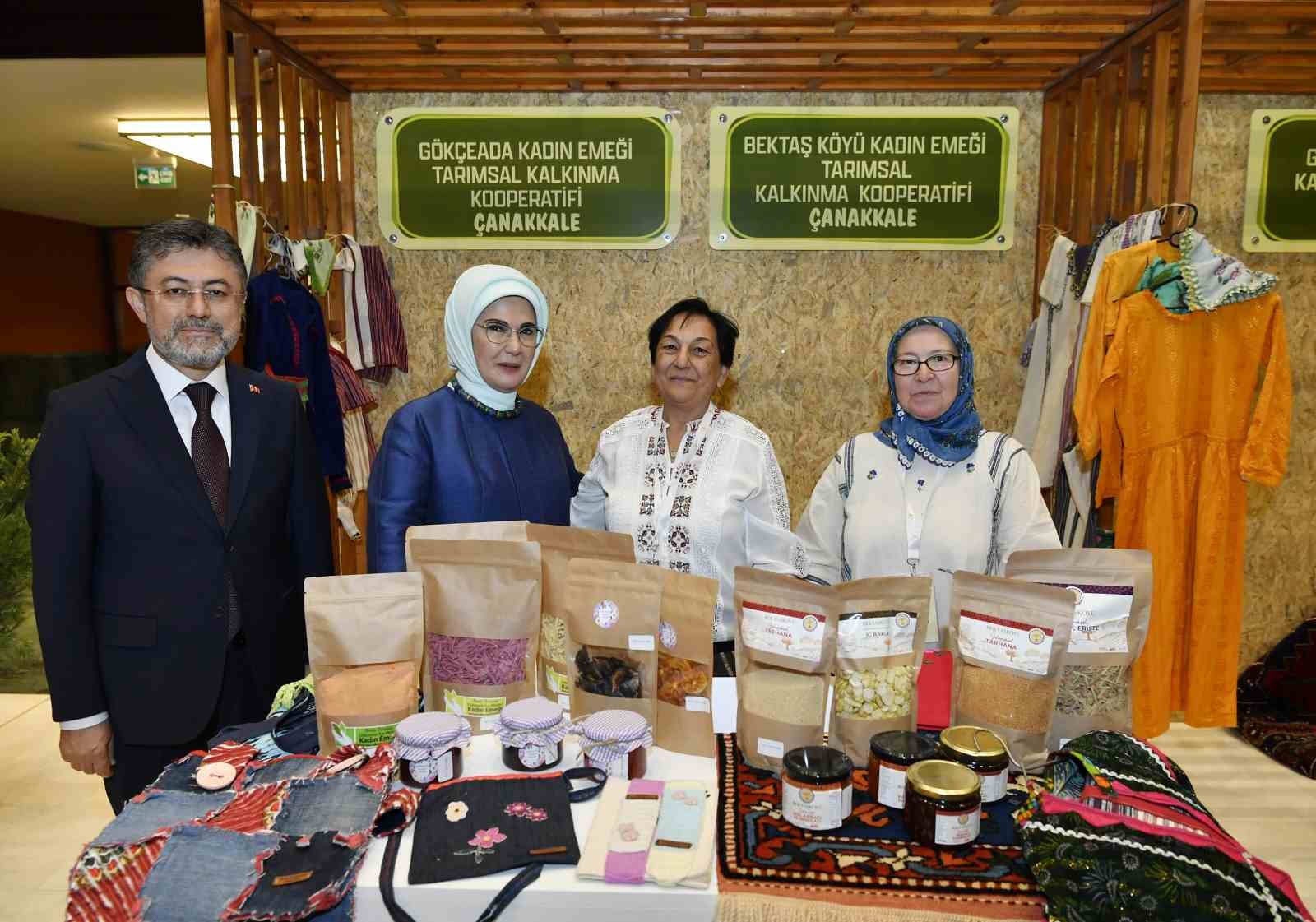 Fuaye alanında kadın çiftçilerin, pamuk dallarından yapılan çiçek buketiyle karşılanan Emine Erdoğan, daha sonra stantlarda kadın çiftçilerin AB Tescilli Coğrafi İşaretli ürünler ile Ankara Sofu kumaşından ürünler başta olmak üzere tarhana, erişte, marmelat, reçel, sabun, kolonya, gül yağı, dokuma ve çeşitli el sanatları ürünlerini tek tek inceledi.