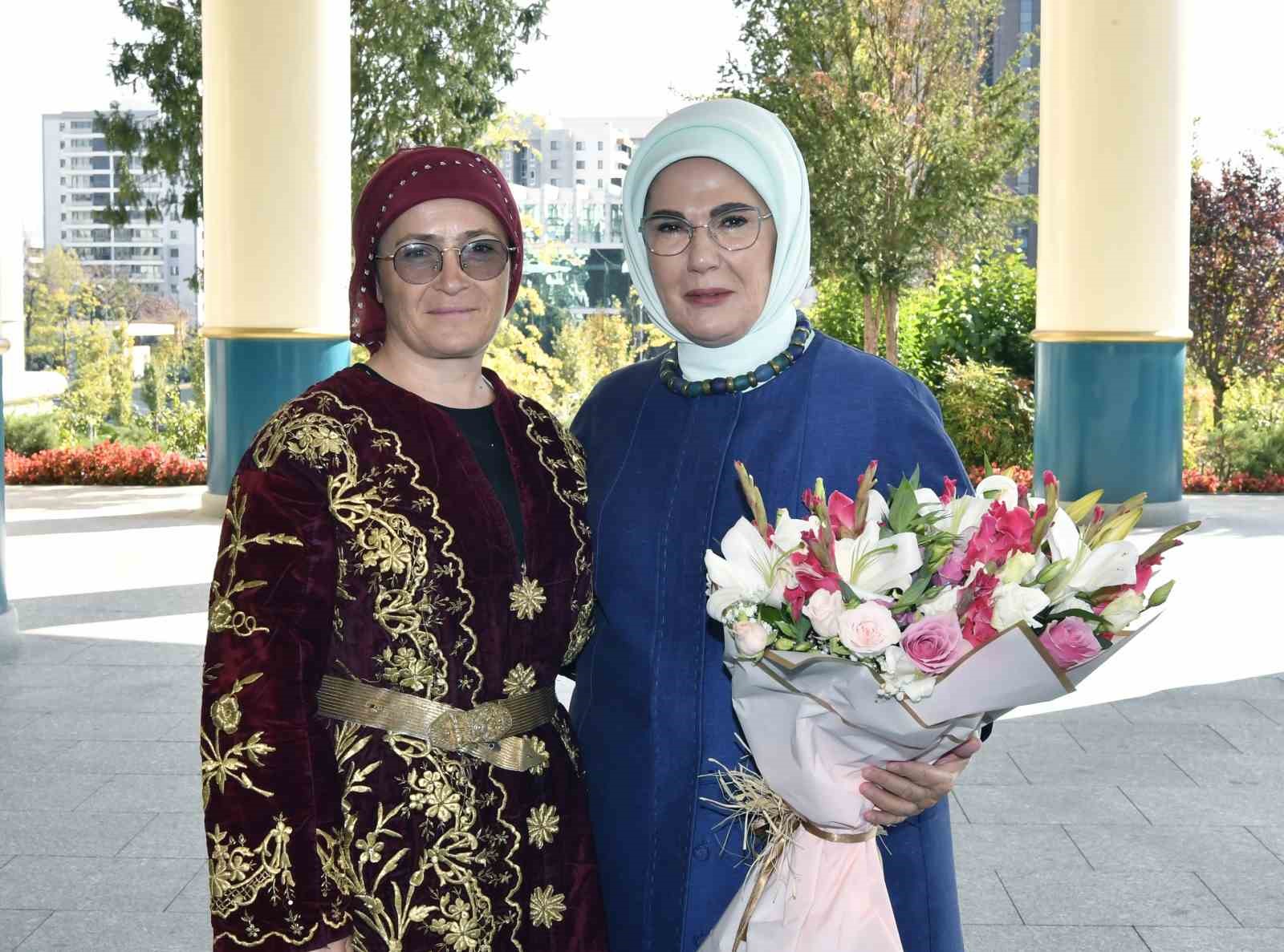 Kadın çiftçilerden kooperatifleri ve ürettikleri ürünlere ilişkin bilgi alan Emine Erdoğan, başarılarından dolayı tebrik edip fotoğraf çektirdi.