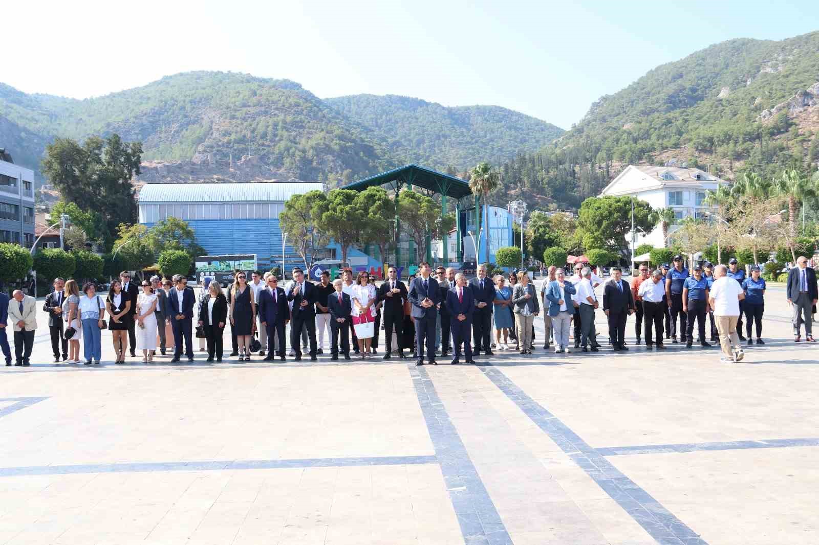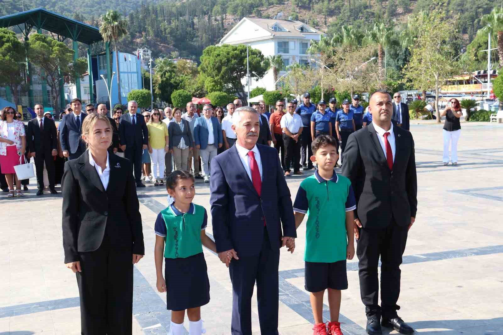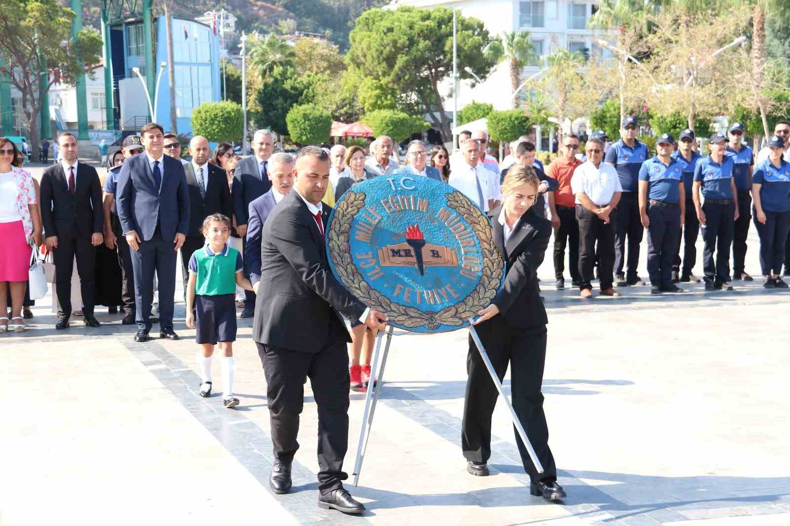 Programda ilk olarak Fethiye İlçe Milli Eğitim Müdürlüğü çelengi, İlçe Milli Eğitim Müdürü Faruk Kaya ve öğretmenler tarafından anıta sunuldu. Daha sonra saygı duruşunda bulunulup, İstiklal Marşı okundu. Törenin bir sonraki bölümünde, Milli Eğitim Bakanı Yusuf Tekin’in 2024-2025 eğitim öğretim yılına ilişkin mesajı okundu.