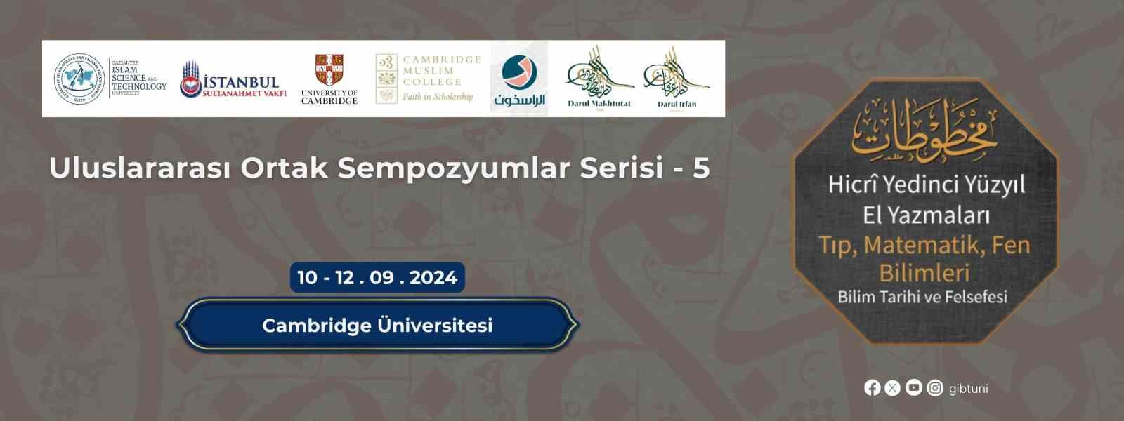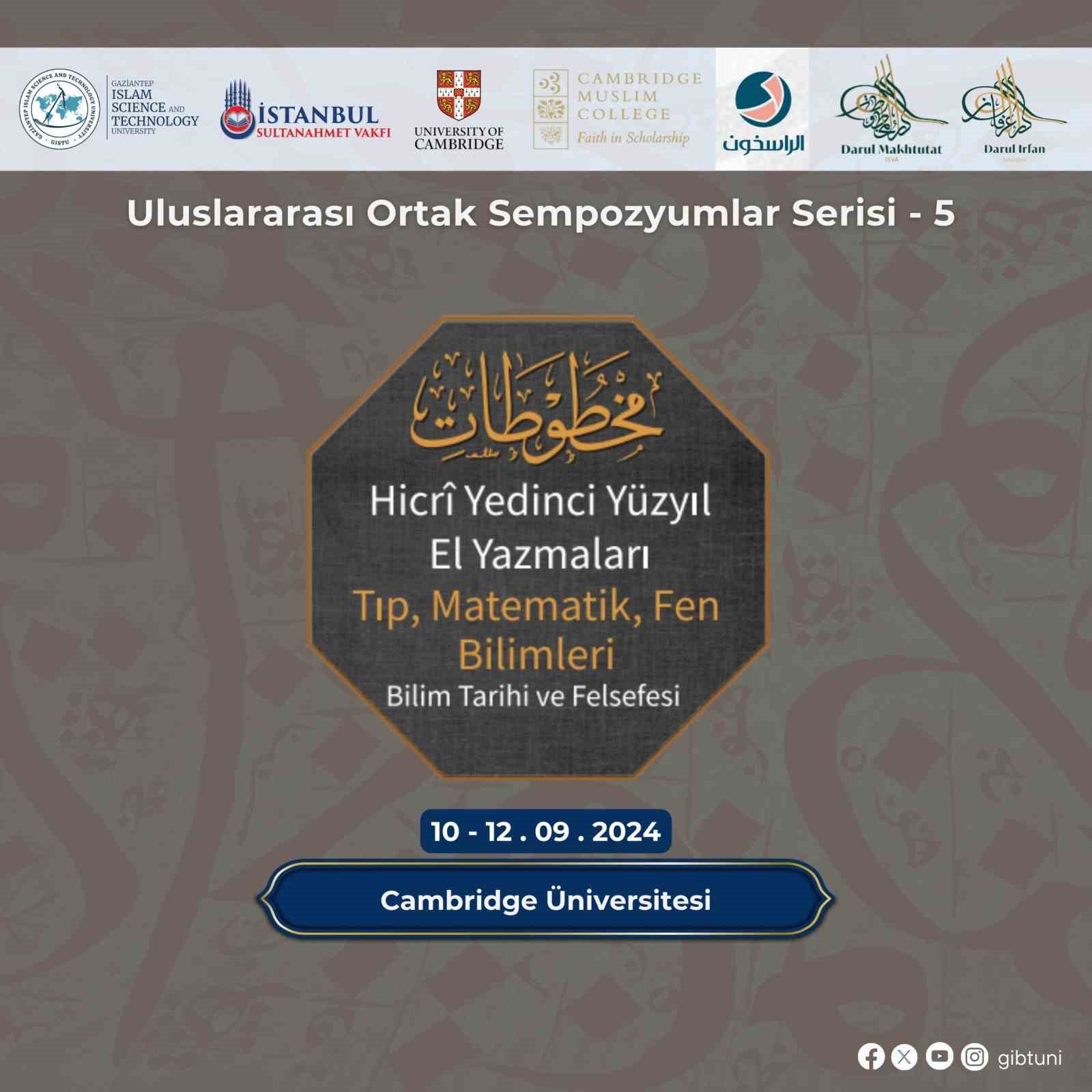 Gaziantep İslam Bilim ve Teknoloji Üniversitesi (GİBTÜ), İstanbul Sultanahmet Vakfı, Cambridge University, Cambridge Muslim College, Darul Makhtutat ve Darul Irfan, Al-Rasikhoon iş birliği ile İngiltere’nin Cambridge Üniversitesinde “Hicrî Yedinci Yüzyıl El Yazmaları: Tıp, Matematik, Fen Bilimleri Bilim Tarihi ve Felsefesi” başlıklı sempozyum düzenlenecek. 10-12 Eylül 2024 tarihleri arasında Cambridge Üniversitesi’nde gerçekleştirilecek, sempozyum özellikle Arap İslam medeniyetinin 4., 7. ve 10. asırlarında bilimin farklı alanlardaki gelişimini ve bu süreçte üniversitelerin oynadığı rolü tartışmaya odaklanacaktır. Alanında uzman akademisyenlerin katkılarıyla, bilimsel bilginin tarihi perspektifler ışığında derinlemesine inceleneceği bu platform, katılımcılara değerli bilgiler sunmayı amaçlıyor.