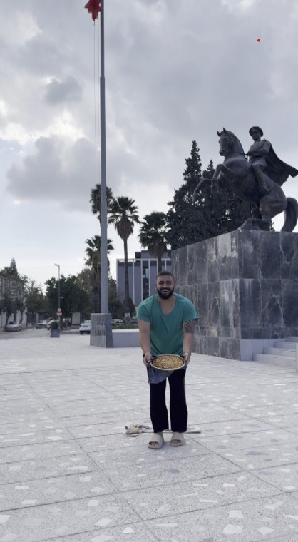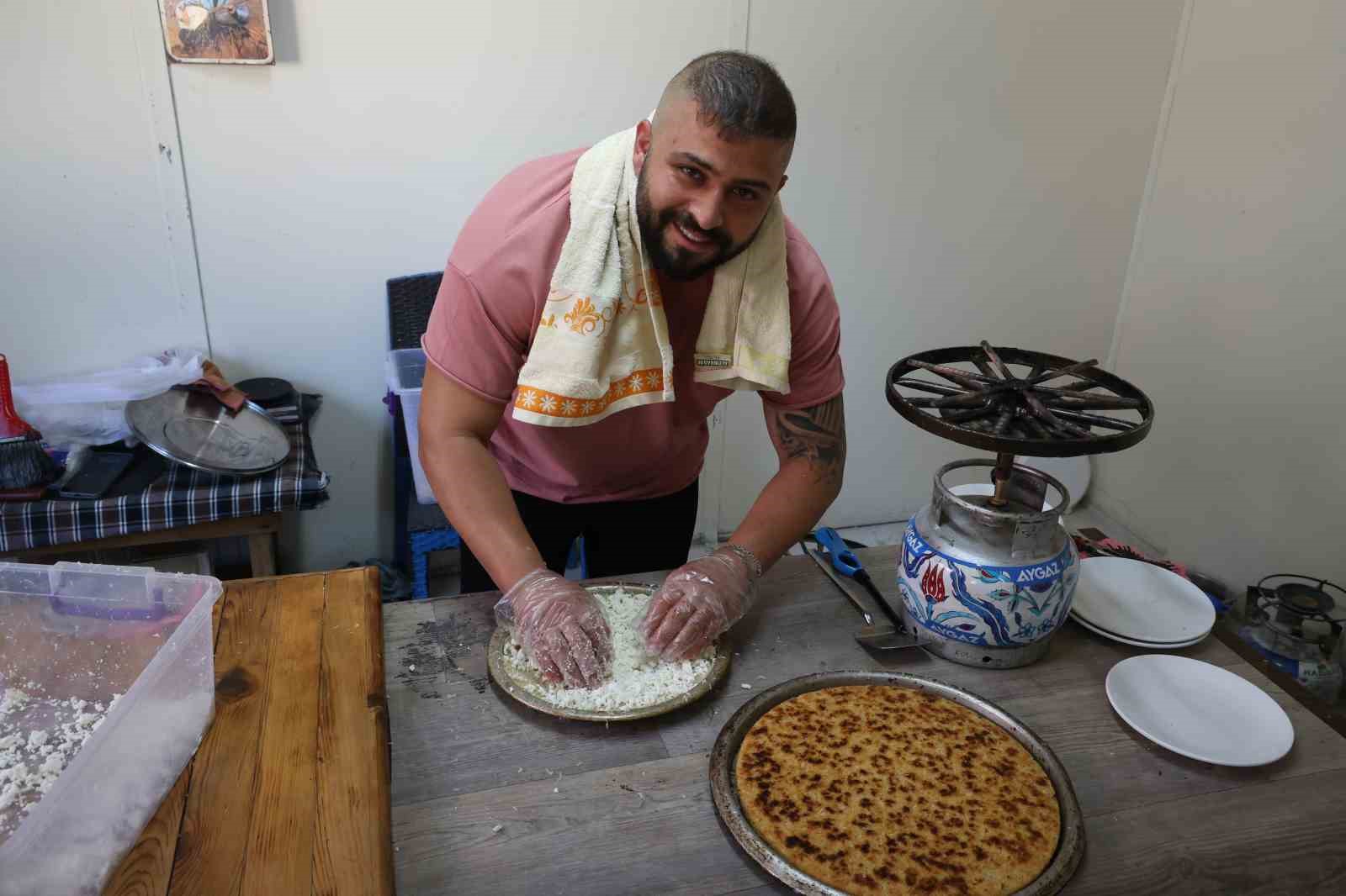 Gastronomi şehri Hatay’ın tescilli lezzeti künefeyi, Köprübaşı mevkisinde prefabrik iş yerinde müşterilerine sunan Nuri İmren, çektiği videoyla arkadaşlarına meydan okudu. Künefeye havada 10 takla attırmayı başaran Nuri Usta, bu anlarıysa sosyal medyada paylaştı. Kısa sürede ilgi odağı olan künefenin metrelerce havaya uçtuğu anlar izleyenleri de gülümsetti. Eşsiz lezzet künefenin tanıtımına fayda sağlayan görüntüler sonrası Nuri Usta, vatandaşları künefe tatmaya davet etti.