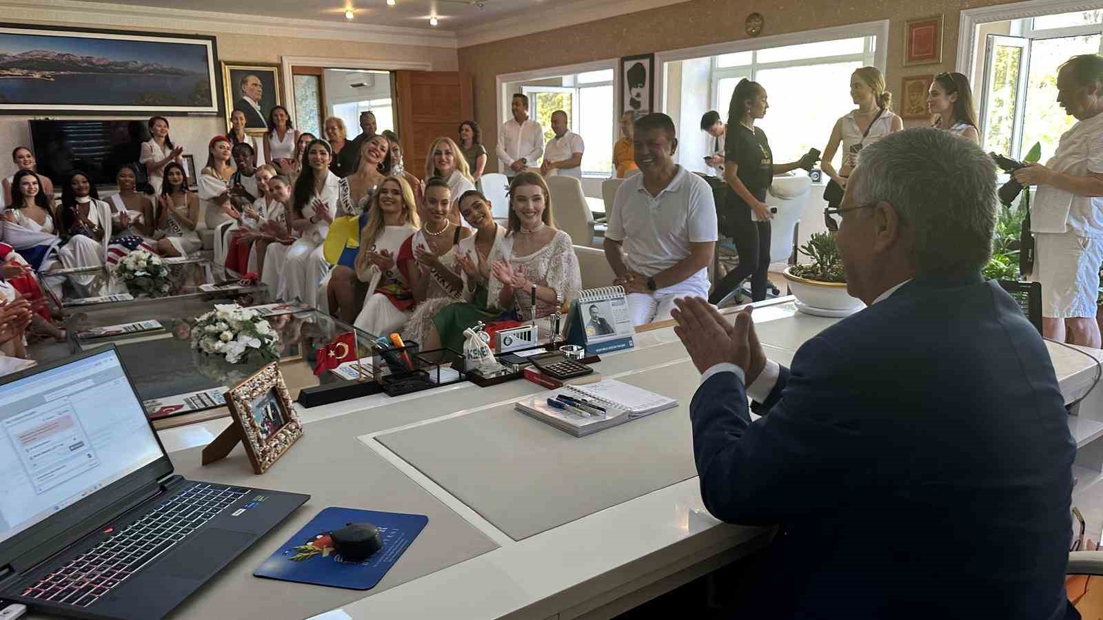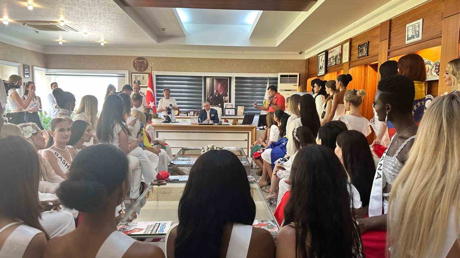 Kemer’de bu yıl 18’incisi düzenlenen Miss Aura International Güzellik yarışması için Kemer’de bulunan 43 ülkeden güzeller yarışmanın organizatörü Adnan Şeker’le birlikte Kemer Belediye Başkanı Necati Topaloğlu’nu makamında ziyaret etti