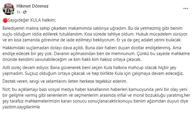 Adli süreç sonunda suçsuz olduğunun ortaya çıkacağını savunan Başkan Dönmez, “Adli süreç devam ediyor. Yargıya güveniyoruz. Bana güvenerek beni seçen Kula halkına mahcup olacak hiçbir şey yapmadım. Suçsuz olduğum ortaya çıkacak ve hep birlikte Kula için çalışmaya devam edeceğiz. Destek veren, sevgi ve selamlarını ileten herkese teşekkür ederim. Ayrıca, bu açıklamayı bazı sosyal medya haber kanallarının haberleri, kamuoyunda yeni bir olay yeni bir gelişme varmış gibi sevenlerim ve seçmenlerim arasında infial ve moral bozukluğu oluşturmuş. Her şey tarafsız mahkemelerimizin kararı sonucu sonuçlanacaktır” dedi.