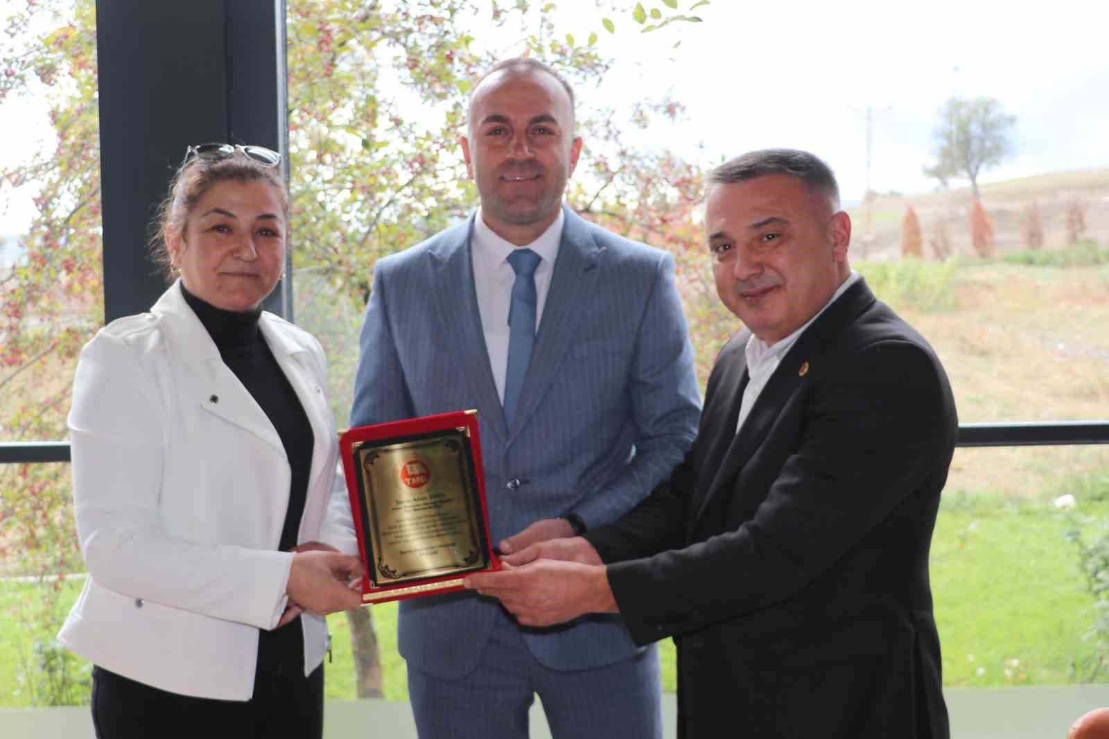 Programda Havza’nın ilk kadın muhtarı Sevil Çelik, Adem Şahin’e derneğe ve muhtarlara katkıları nedeniyle plaket takdim etti.