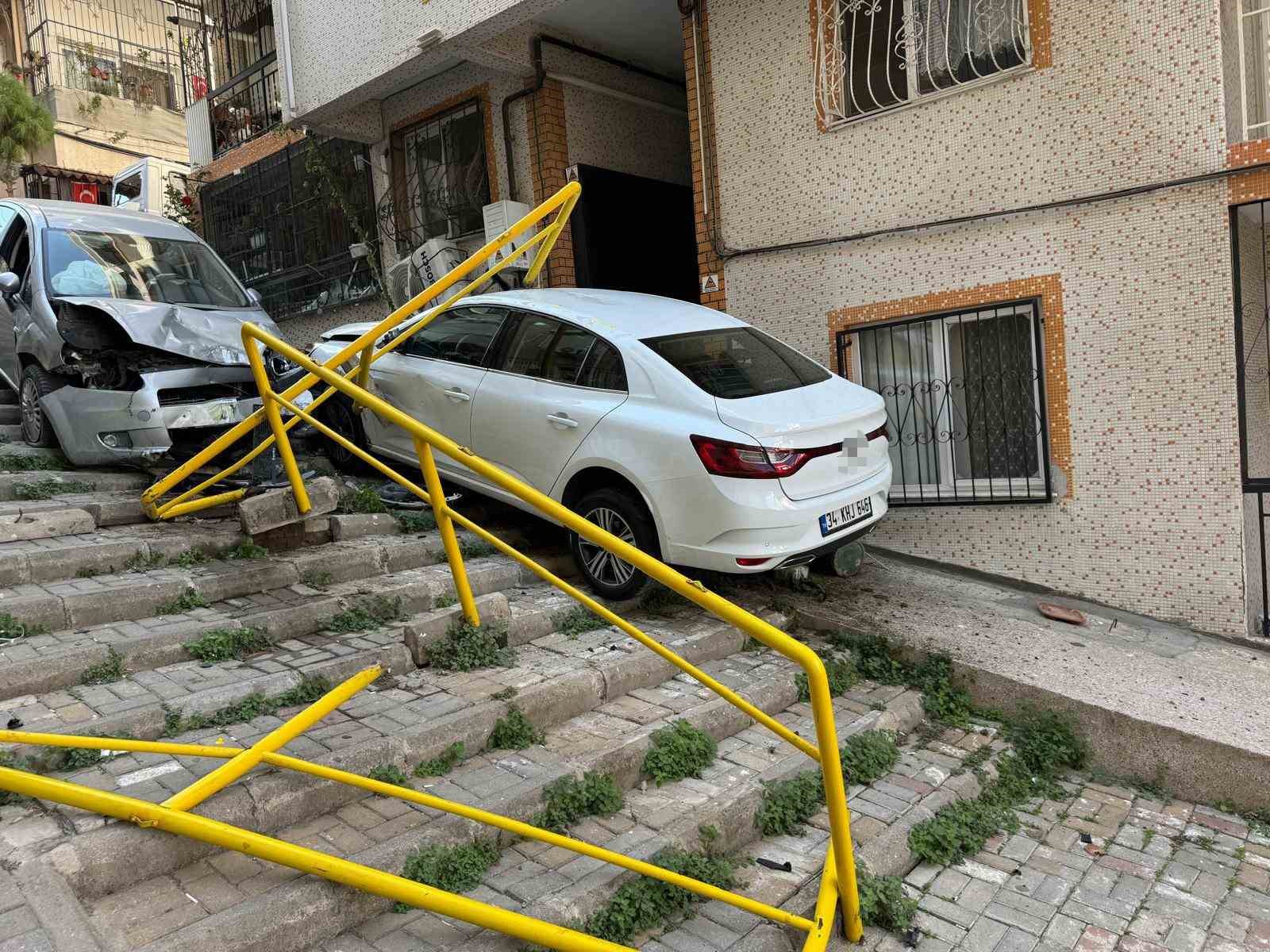 Olay bu sabah Piri Reis Mahallesi 249 Sokakta meydana geldi. Edinilen bilgiye göre, Ayberk T. isimli sürücünün kullandığı 35 UGD 96 plakalı Fiat Punto marka otomobil, bir bölümü merdivenli olan sokaktan rampa aşağı inerek park halindeki 34 KHJ 646 plakalı bir otomobile çarptı. Çarpmanın şiddetiyle sürüklenen araçlar merdivenli bölüme düştü. Kazada, merdiven tutamakları ve çevredeki bazı binaların duvarı hasar gördü.