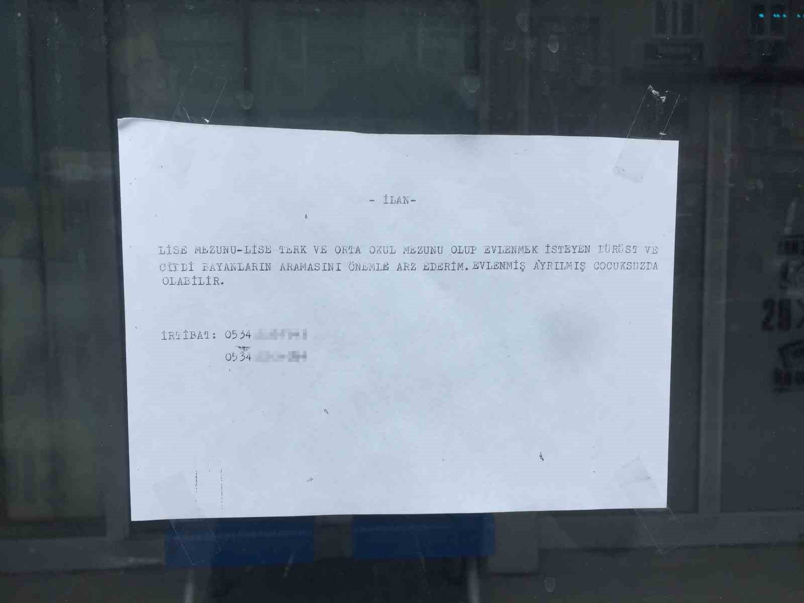 ADANA (İHA) – Adana’da bir kişi, otobüs durağına astığı, “Lise mezunu, lise terk ve ortaokul mezunu olup evlenmek isteyen ciddi bayanların aramasını önemle arz ederim” başlıklı ilanla evlenecek kadın aradı.