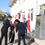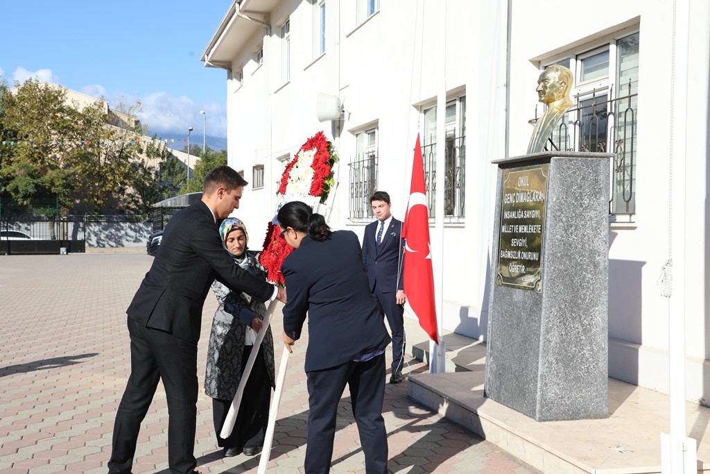 Tören, Saygı Duruşu ve İstiklal Marşının okunmasıyla başladı. Ardından Muhtarlar Derneği Başkanı Oktay Garip, kadın muhtarlarla birlikte Anıt önüne çelenk sunumunu yaptı.