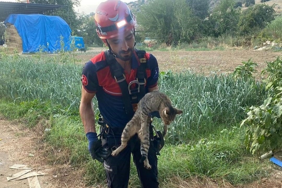 İzmir’in Tire ilçesinde bir su kuyusuna düşerek mahsur kalan kedi, itfaiye ekiplerinin başarılı operasyonuyla kurtarıldı.