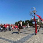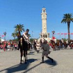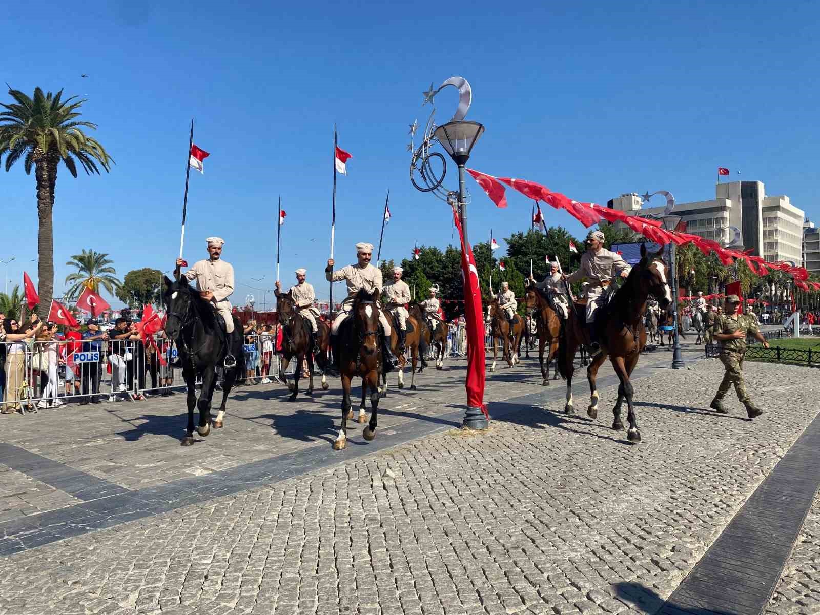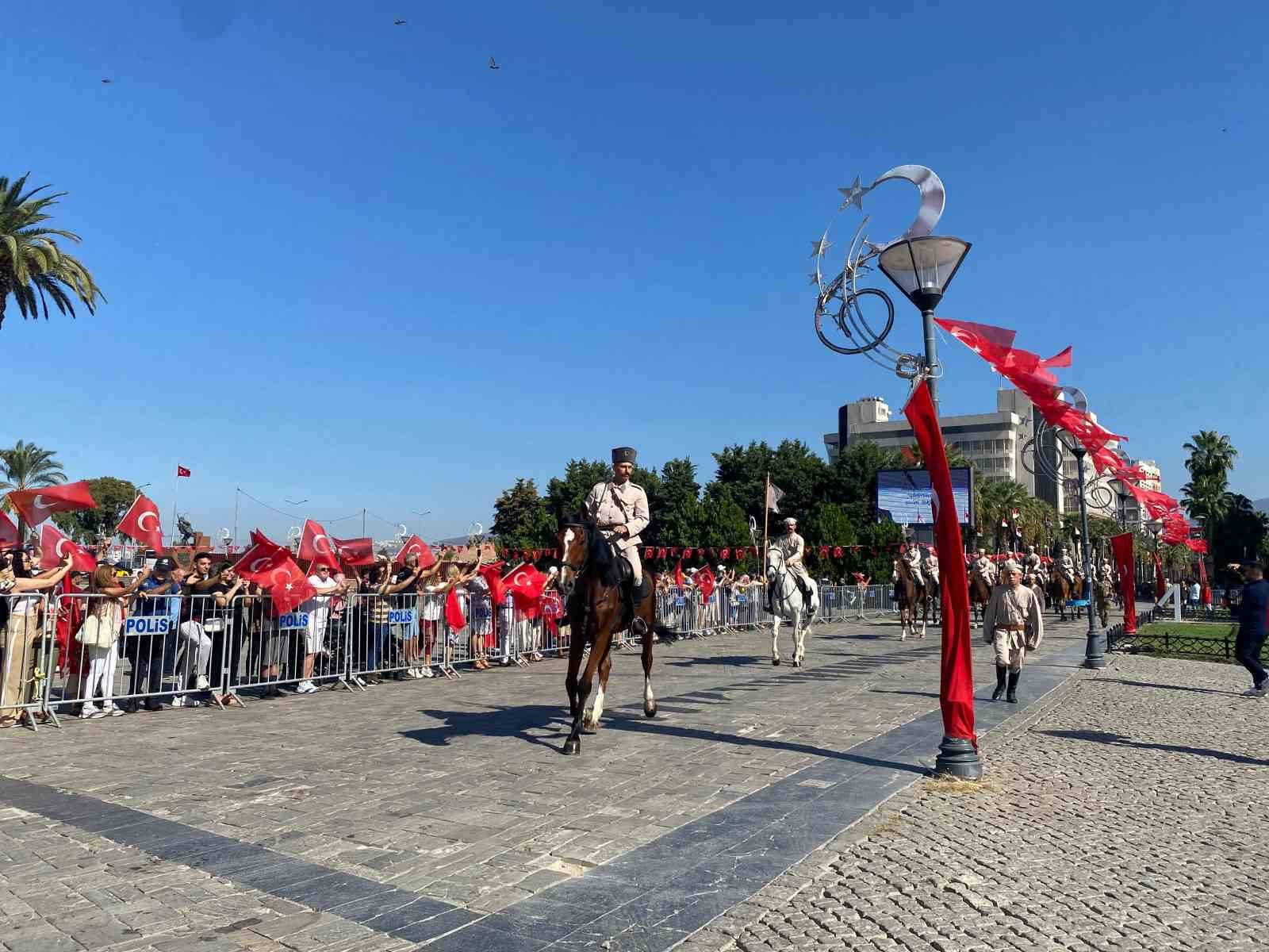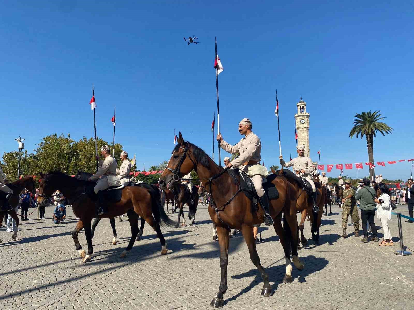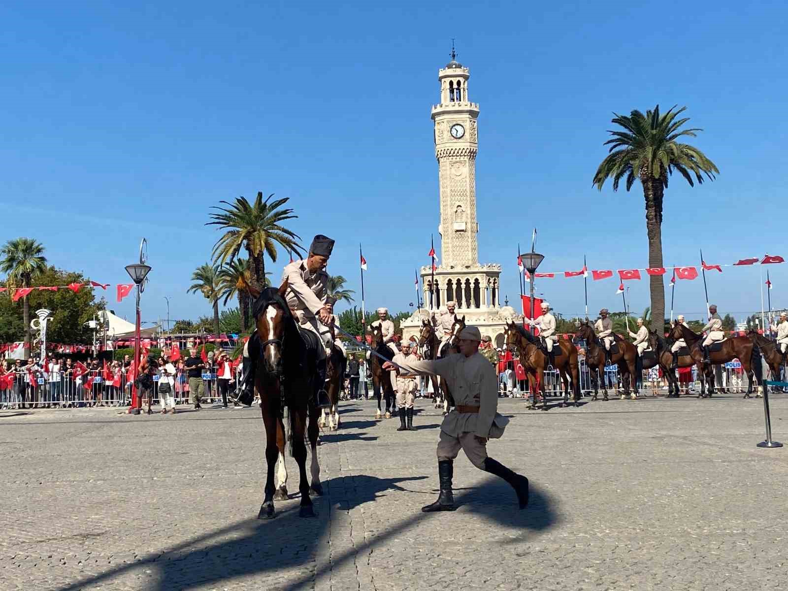 Buradaki törenin ardından süvari birlikleri İzmir’in kurtarılmasını canlandırdı. Atatürk Meydanı’na gelen birlik, vatandaşlardan büyük alkış topladı. Saygı duruşunda bunulmasının ardından Hükümet Konağı’na çıkan asker, Türk bayrağını göndere çekti. Daha sonra Vali Elban, süvari birlik komutanına Kur’an-ı Kerim ve bayrak takdiminde bulundu. Başkan Cemil Tugay da süvari birlik komutanına plaket takdim etti.