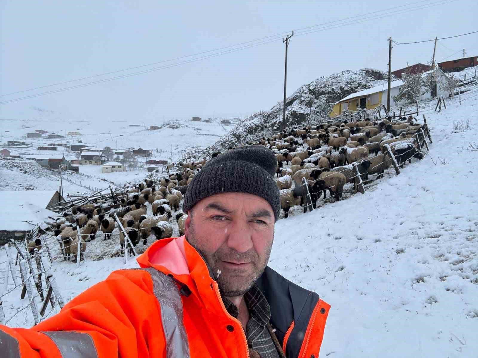 Yaz mevsiminin büyük bir bölümünü Kadırga Yaylası ve bağlı obalarında koyunları ile geçiren sürü sahibi Ümit Yazıcı, yaylaya düşen karla birlikte sürüsü ile daha alçaktaki mezralara doğru yola çıktı. O anları sosyal medya hesabından paylaşan Yazıcı, beyaz örtüyle kaplanan yayladan dönüşe geçtiklerini söyledi.