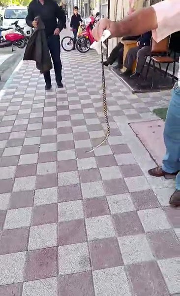 Bursa’nın Karacabey ilçesinde kahvehaneye girerek vatandaşlara korku dolu anlar yaşatan yılan, sokak ortasında bir vatandaş tarafından yakalandı.