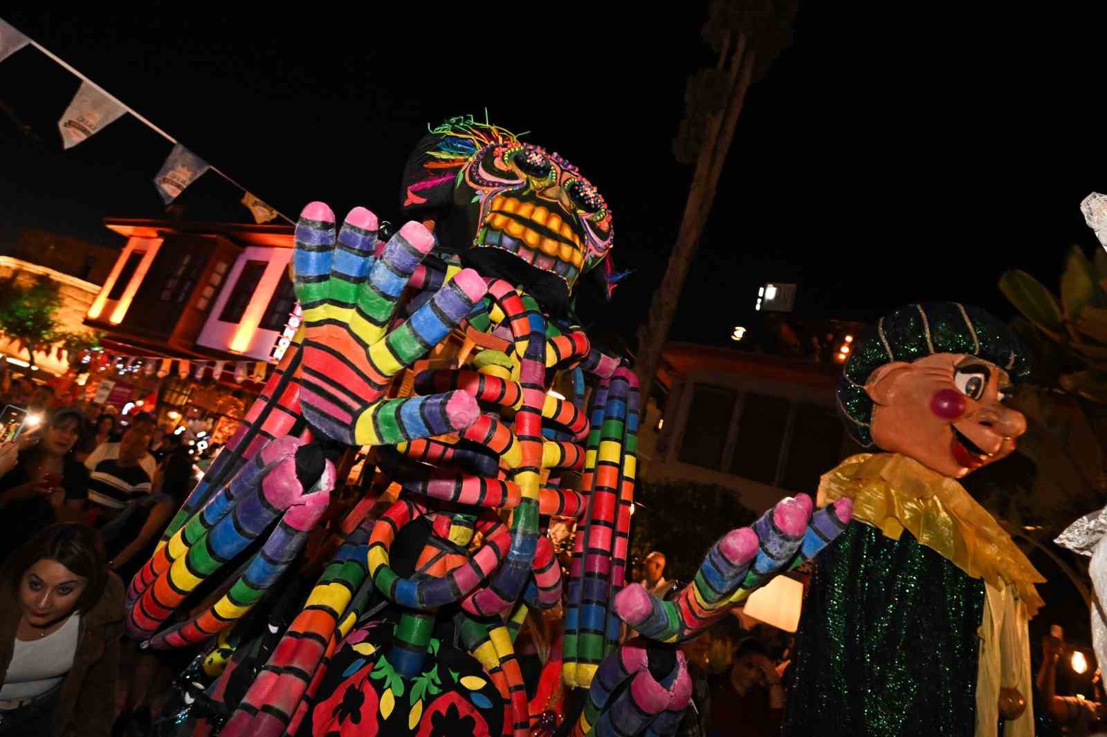 Festival bandosunun hareketli şarkılarına Kaleiçi tüm misafirleriyle eşlik ederken, tahtabacaklar, ateş sihirbazları ve büyük kafalarıyla festival maskotları Kaleiçi’nin tarihi sokaklarından geçiş yaptı. Kortej, Kaleiçi’nin en görkemli yapılarından tarihi Hadrian Kapısı’ndan Atatürk Caddesi’ne ulaştı ve Cumhuriyet Meydanı’nda sona erdi.