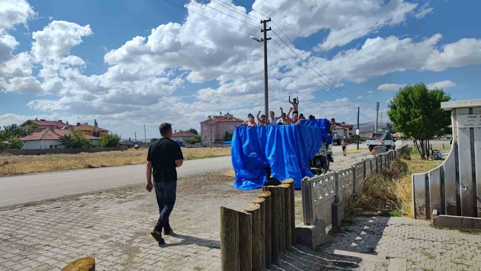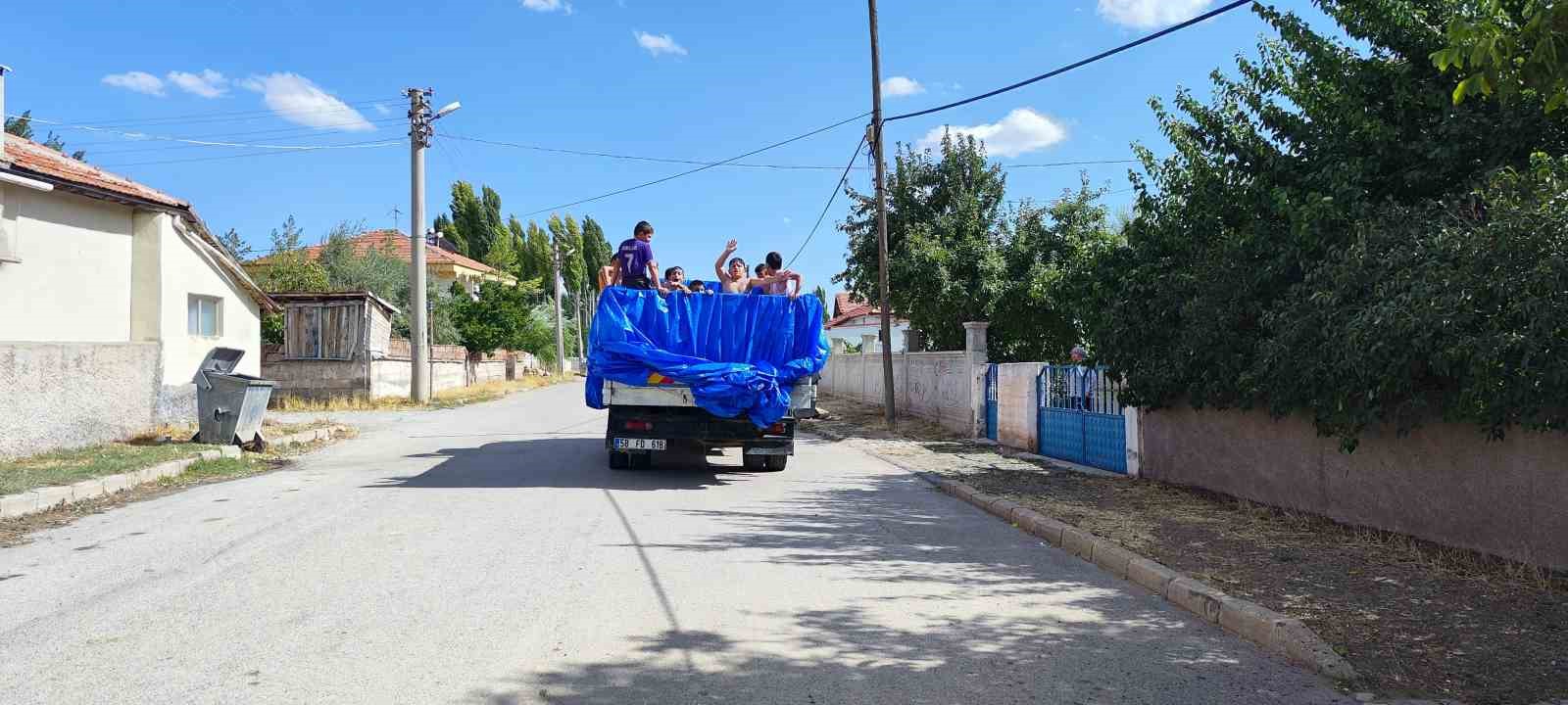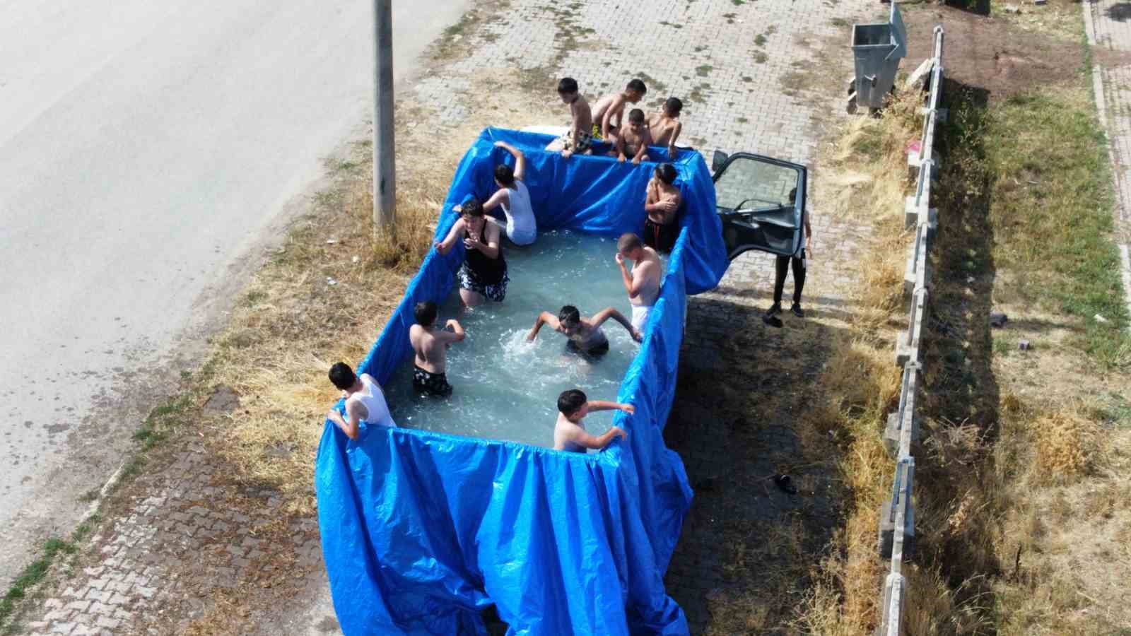 Sivas’ın Şarkışla ilçesinde bir muhtar kamyonun kasasını havuza dönüştürerek çocukların yüzünde tebessüm oluşturdu.