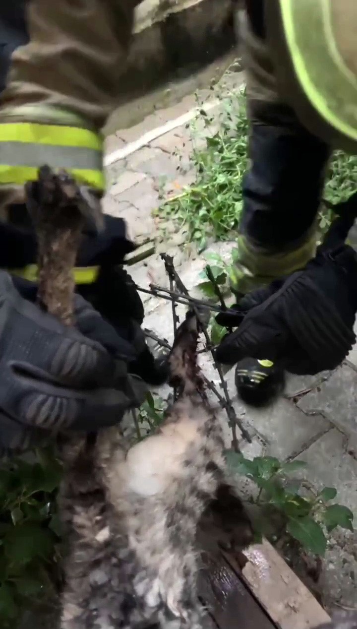 Kartal’da bahçe duvarında bulunan dikenli tellerde mahsur kalan kedi, itfaiye ekiplerinin müdahalesiyle kurtarıldı. O anlar cep telefonu kamerasına yansıdı.