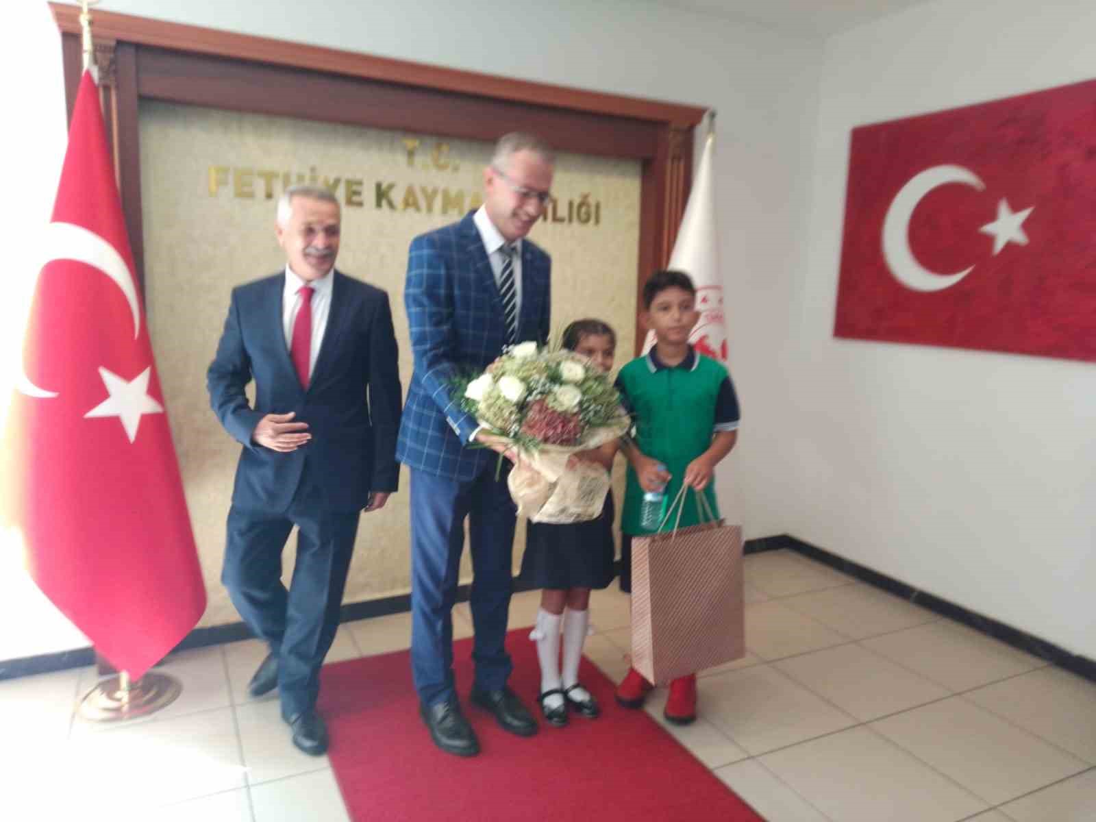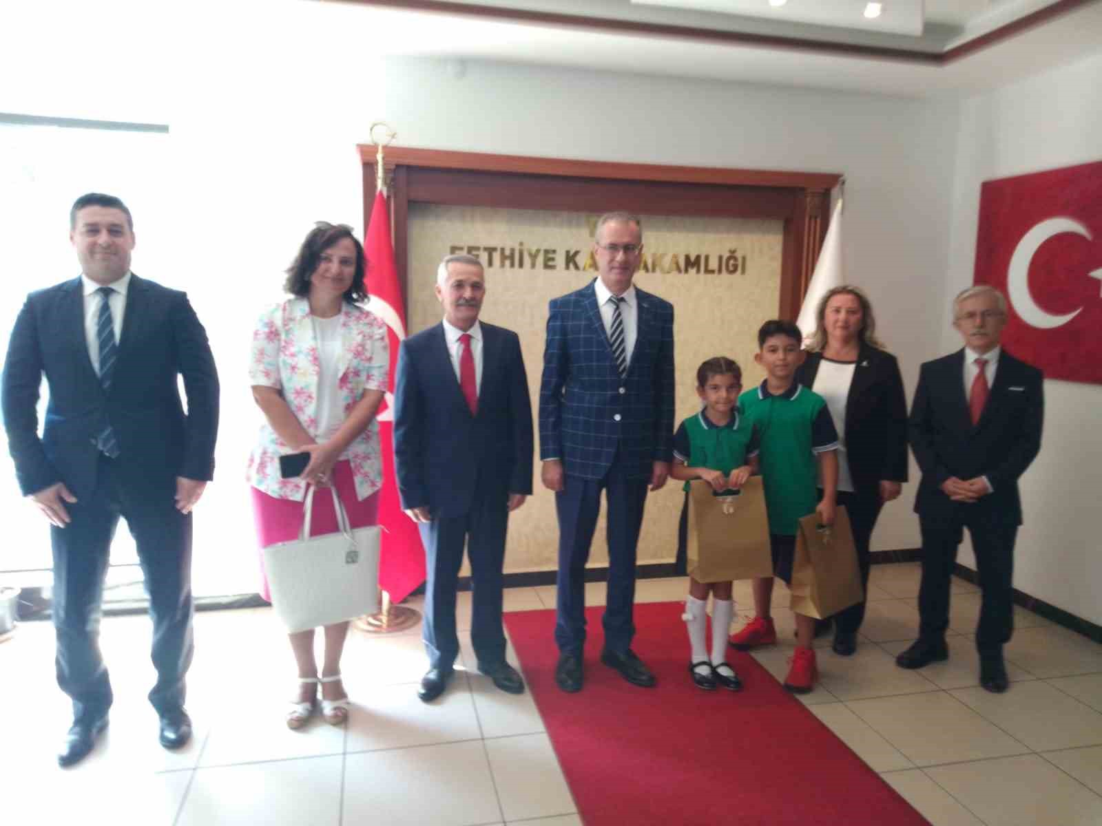 Fethiye İlçe Milli Eğitim Müdürü Faruk Kaya, Milli Eğitim Şube Müdürleri Gönül Ertaş, Ekrem Gürhan, Erdinç Kara, Mustafa Karslıoğlu İlkokulu Müdürü Bengü Büyükteke ve öğrenciler ile birlikte Fethiye Kaymakamı İsmail Hakkı Ertaş’a ziyarette bulundu. Kaymakam İsmail Hakkı Ertaş ziyarette yaptığı konuşmada, “Bugün çok güzel bir gün, okullarımız açılıyor. Yeni Eğitim ve Öğretim yılına başlıyoruz. Yeni Eğitim ve Öğretim yılımız Ülkemize, ilçemize hayırlı uğurlu olsun” ifadelerini kullandı.