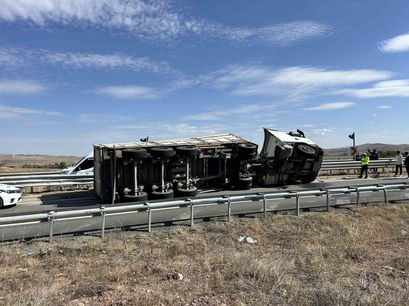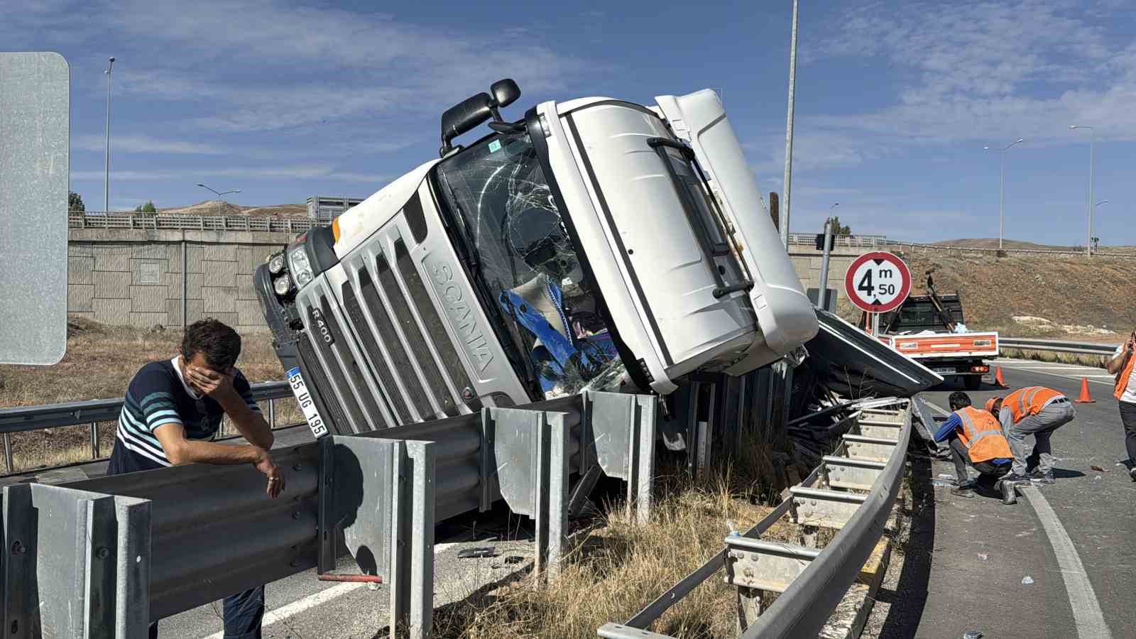 Sivas’ta Kovalı kavşağında 380 derecelik yay şeklindeki keskin virajı alamayan mermer yüklü tır sürücüsü aracı devirdi. Kazayı yara almadan atlatan sürücünün üzüntüsü görenleri de üzdü.