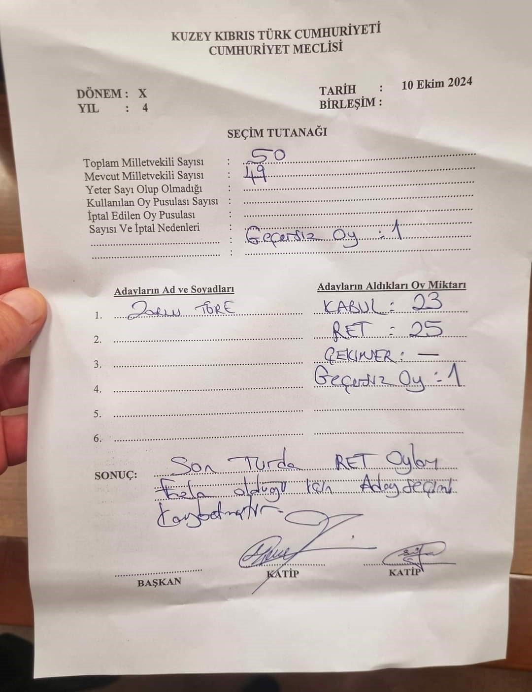 Zorlu Töre, 5 tur yapılan seçimin son turunda 23 evet oyuna karşılık 25 hayır oyu almasına rağmen “Tek aday olduğum için kazandım” diyerek oturumu kapattı. Hayır oylarının evet oylarından fazla olduğunu belirten CTP milletvekilleri, oturumun kapatılmasına sert tepki gösterdi. Zorlu Töre tek aday olduğu için 23 kabulün yeterli olduğunu savundu. Bayındırlık ve Ulaştırma Bakanı Erhan Arıklı gazetecilere yaptığı açıklamada, Başsavcılık’tan görüş alınacağını söyledi. CTP’nin konuyu yargıya taşıması beklenirken, bir sonraki toplantının tarihi ise açıklanmadı. Öte yandan UBP Milletvekili Faiz Sucuoğlu, Genel Kurul toplantısına katılmadı.