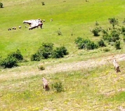 Erzincan’da iki kurt yaylada otlayan koyun sürüsüne, kavalı bırakıp dron ile sürü güden çoban ise kurtlara pusu attı.