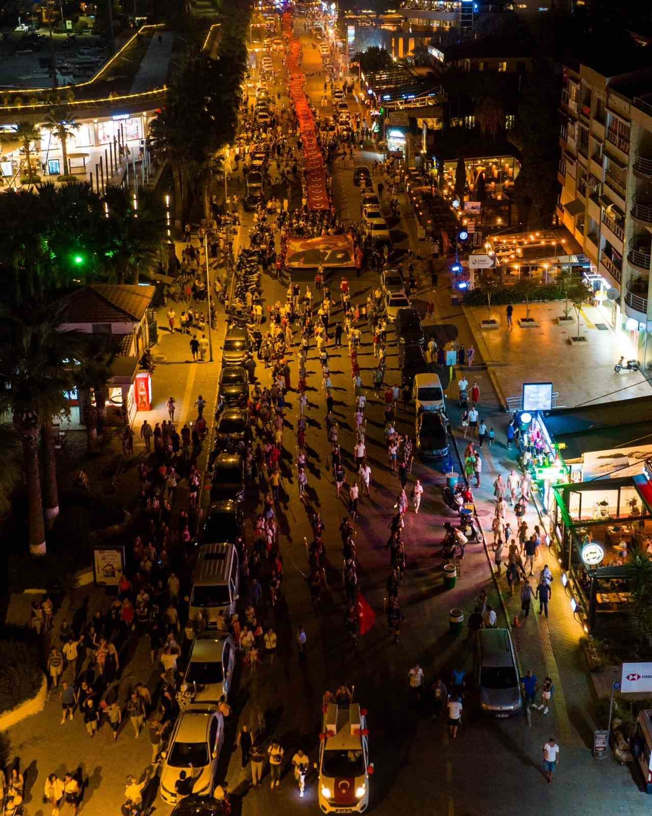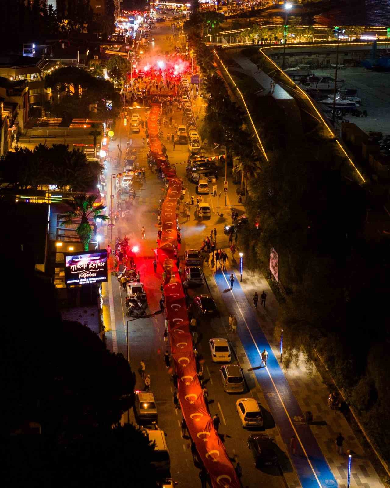 Fener alayı saat 20:00’de Kısmet Otel kavşağından başladı. Atatürk Bulvarı üzerinde devam eden yürüyüşe 7’den 70’e binlerce Kuşadalı ile birlikte Kuşadası Belediye Başkan Vekili Tibet Özer, belediye meclis üyeleri, CHP Kuşadası ilçe yöneticileri ile çeşitli sivil toplum örgütlerinin temsilcileri katıldı. Ellerinde Türk bayrakları ve Atatürk posterleri taşıyan Kuşadalılar, çalınan marşlar eşliğinde meşalelerle İsmail Cem Dostluk ve Barış Meydanı’na yürüdü. Büyük bir coşku içerisinde gerçekleşen fener alayında 250 gönüllünün taşıdığı 250 metrelik dev Türk Bayrağı açıldı. Kutlama programının son bölümünde ise Kuşadası Kent Orkestrası sahne aldı. İsmail Cem Dostluk ve Barış Meydanı’nda verilen konser, Kuşadalıların kurtuluş günü coşkusunu ikiye katladı.