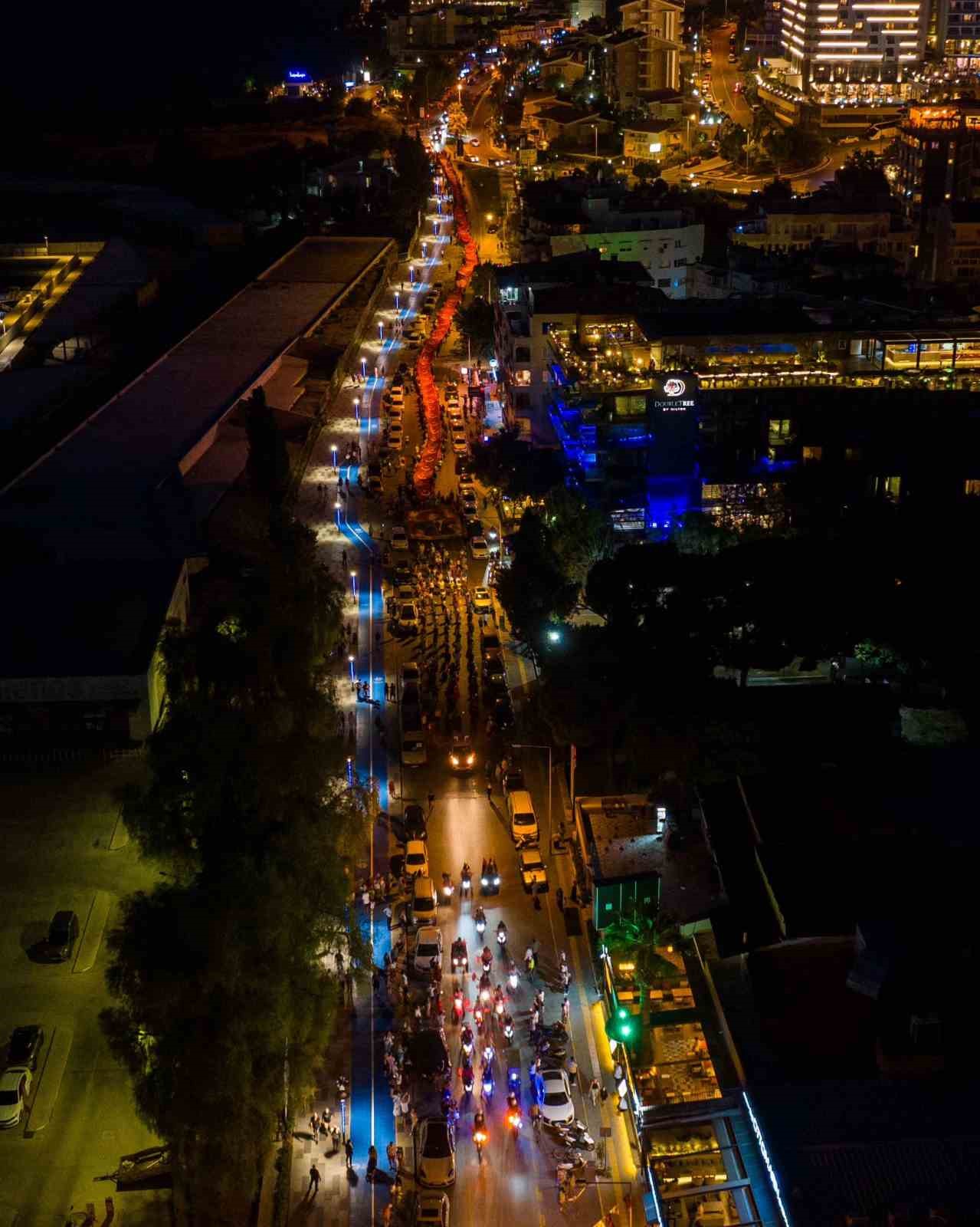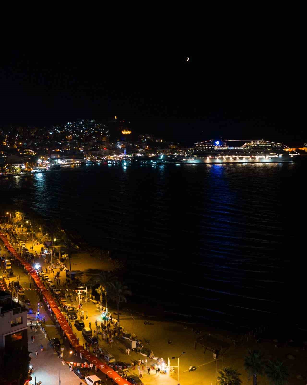 Kuşadası’nın düşman işgalinden kurtuluşunun 102’nci yıl dönümü dolayısıyla Kuşadası Belediyesi tarafından kentte fener alayı düzenlendi. Akşam saatlerinde Kısmet Otel kavşağından başlayan ve İsmail Cem Dostluk ve Barış Meydanı’nda sona eren fener alayında 250 metrelik dev Türk Bayrağı açıldı.